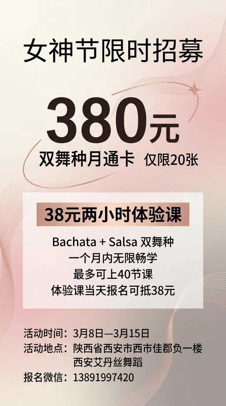 当前位置:首页>美女资讯>女神节限时招募|380元双舞种月通卡,仅限20张