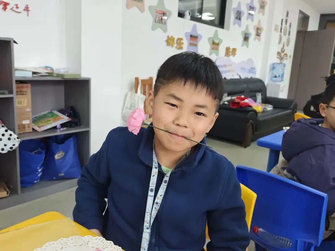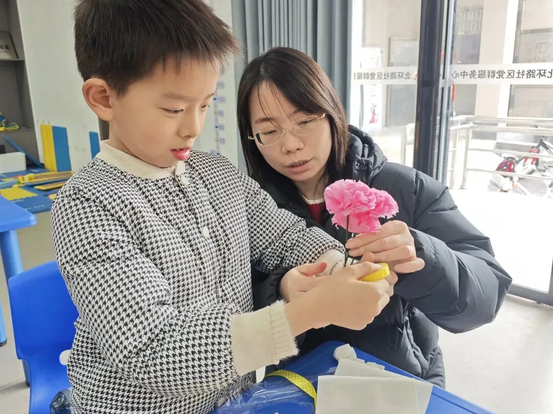 讲解过后,DIY 花束手工制作环节正式开始。志愿者为孩子们分发制作材料包,老师耐心讲解拆分、折叠、粘贴、造型等制作步骤。孩子们认真聆听、学好方式方法,迫不及待的动手实践,将一片片彩纸变成一朵朵精致的粉色花朵。单枝的康乃馨陆续完成,但心意不止于此。接下来,孩子们学习如何将几朵花组合成一束,并用漂亮的包装纸和丝带进行装饰。“选三朵康乃馨搭配在一起,高低错落会更好看”,“包装纸可以这样斜着放,一层一层包裹住花茎,最后系上一个蝴蝶结”,“老师,快来帮帮我,我不会扎蝴蝶结”......孩子们变成了小小的花艺师,精心设计着自己的作品。每一束美丽而独特的手工花束,都凝结了孩子最纯粹的心意。