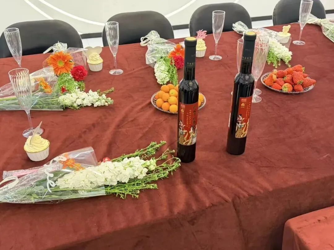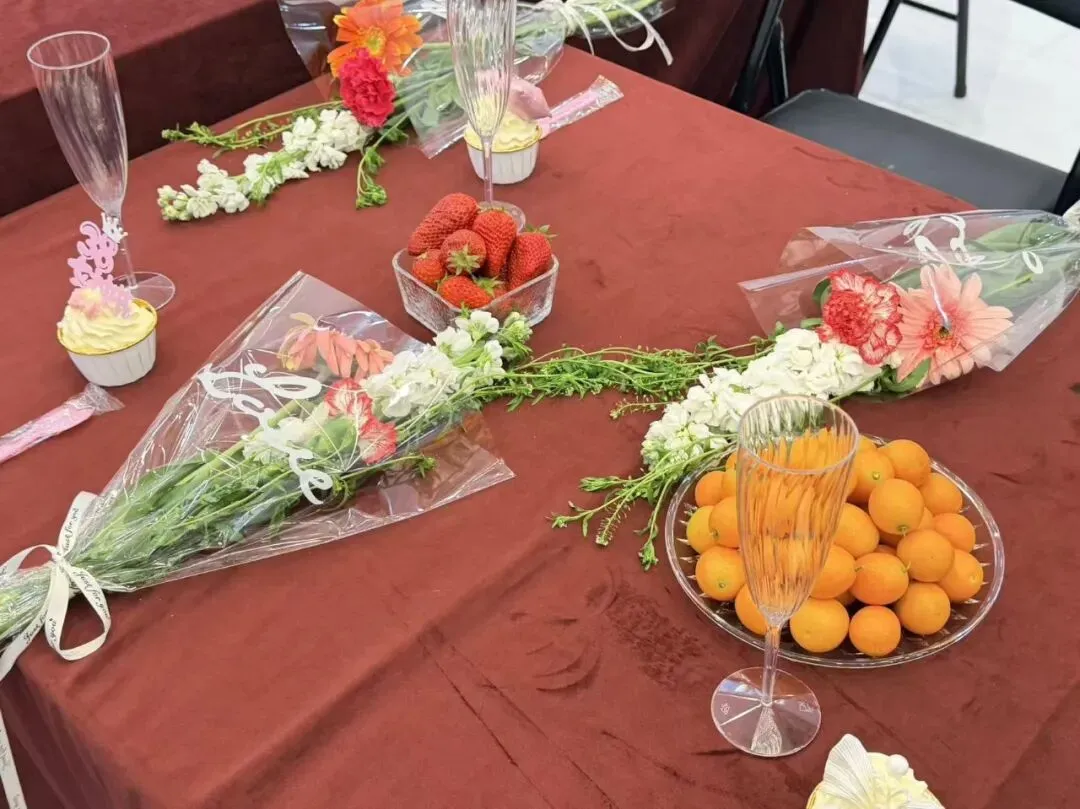 现场布置温馨雅致,花香萦绕,精心准备的醇香红酒、精致甜品整齐摆放,氛围感拉满。