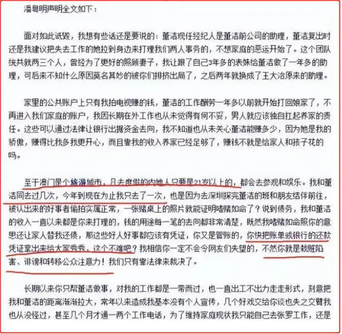 董洁的纪经人任佳莺,以“董洁工作室团队”的名义微博发布小作文,表示董洁已经和潘粤明分手,并直指潘粤明“嗜赌”“粗暴”“欠债”,甚至还半遮半掩地拎出了“x无能”……