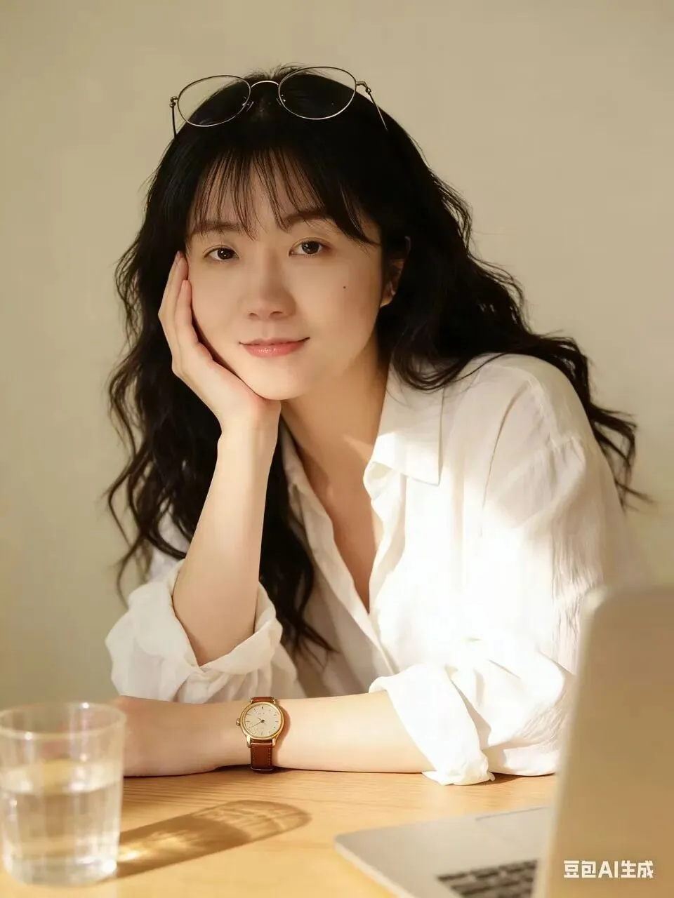姿态:右手掌心托着脸颊,头部轻靠于手部,眼神直视镜头,嘴角带浅淡笑意,肢体姿态放松自然。