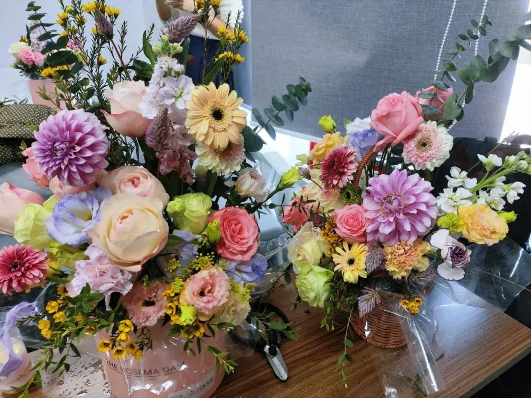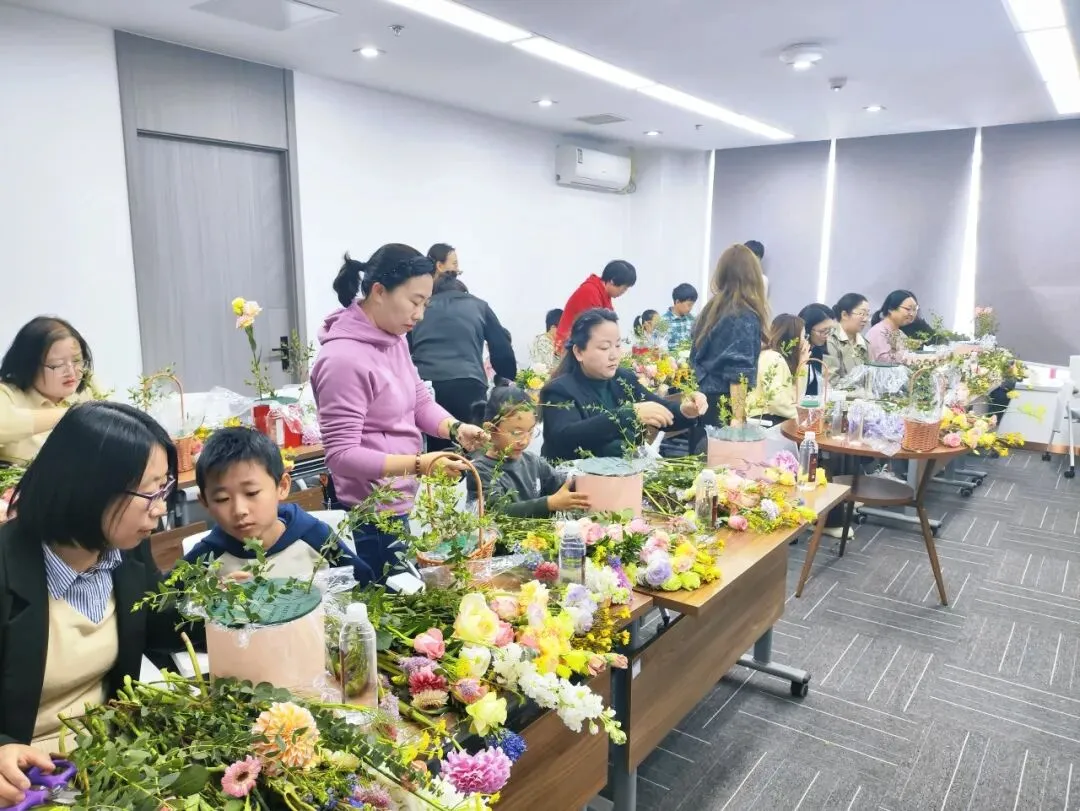 主持人张昊老师简要介绍本次活动后,沂果花湉主理人刘媛媛从韩式花束搭配、层次构图到修剪技巧进行了细致讲解与现场指导。平日里在各专业领域干练的女性朋友们,化身浪漫创作者,剪枝、配色、塑形,将理性审美与温柔巧思融入鲜花手作。