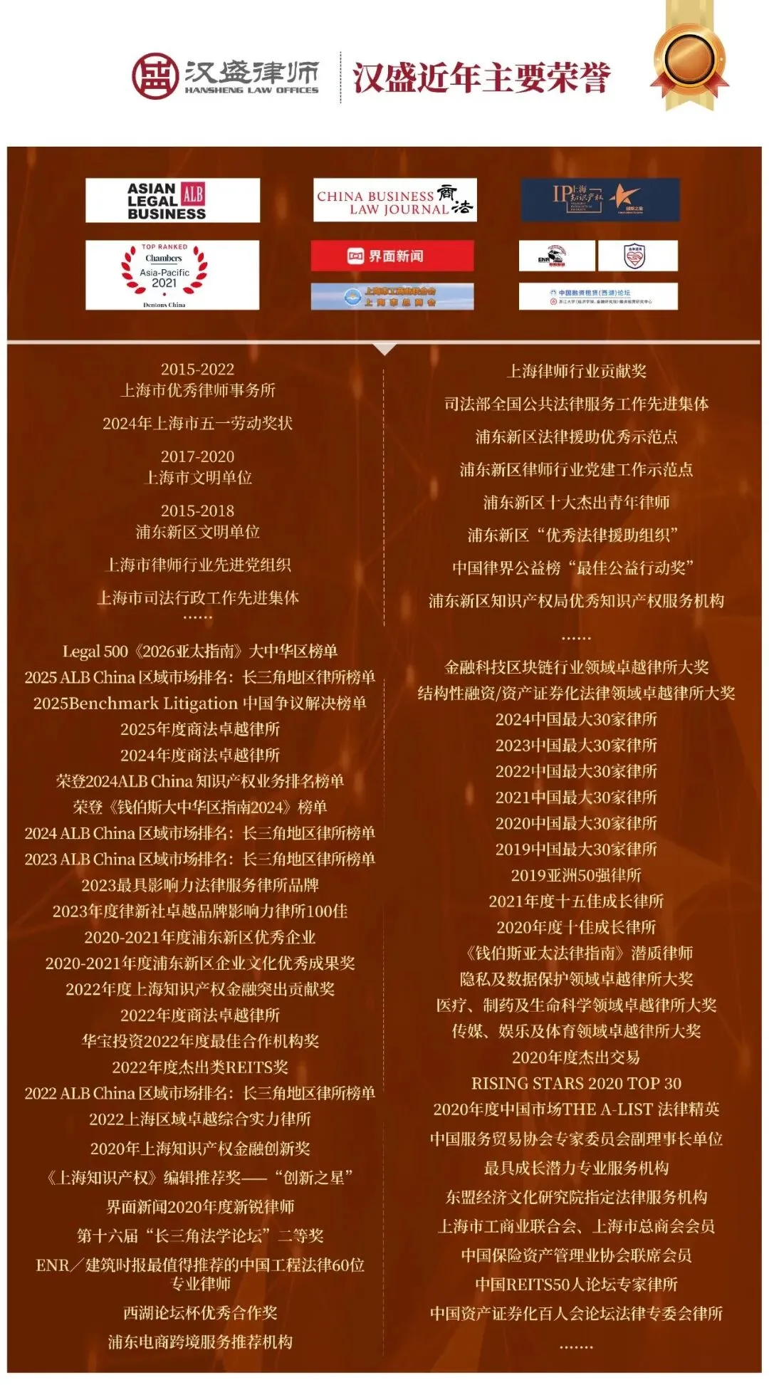 近三十年的专业和历史沉淀,汉盛已在知识产权、金融与证券、建筑与房地产、刑事辩护、国际业务、互联网法律、兼并收购、公司治理与合规经营、境外投资、基金、税务、文化传媒、能源与环保、争议解决、破产与清算等诸多业务领域取得行业领先优势,拥有极其丰富的法律服务经验。未来,汉盛将始终秉承“承中融西、至信至臻”的宗旨,不断朝着专业化、品牌化、国际化的方向稳步迈进,为客户的成功保驾护航。
