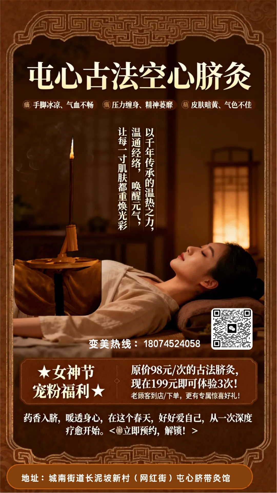 更幸运的是,这脐带灸已经悄然来到我们的身边,而且让我们普通老百姓都能触手可及,由此在新春伊始,暨有3.8女神节来临之际,怀化屯心脐带灸养生馆特开展感恩回馈活动,让我们一起来享受脐带灸的健康美妙体验吧!