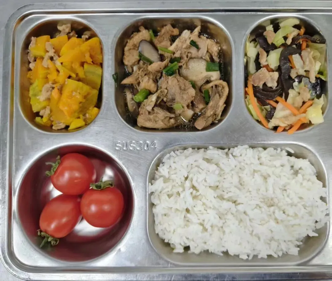 午餐示例5:香菇蒸鸡+包菜木耳炒肉+肉沫蒸南瓜+米饭+水果
