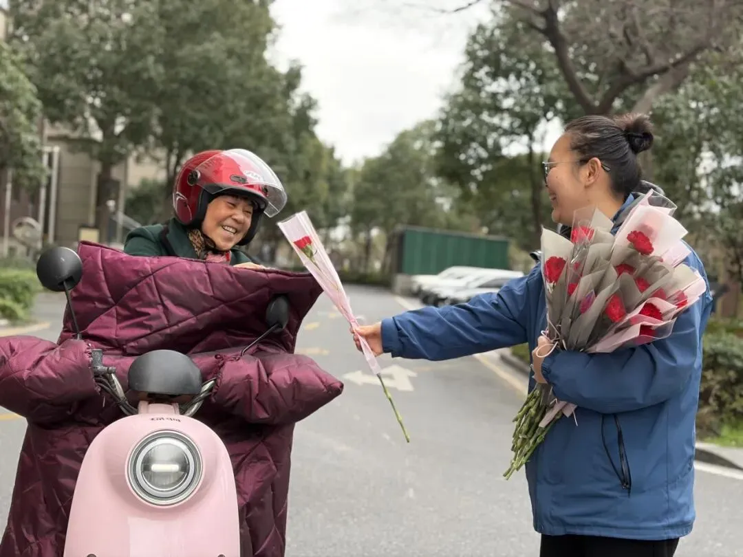 收到鲜花的业主们,脸上无不洋溢着惊喜与感动的笑容。有步履匆匆的上班族女性,在接过鲜花的那一刻,疲惫的神情瞬间被明媚的笑容取代;有结伴而行的阿姨们,接过花后开心地合不拢嘴,连声道谢。一时间,花香与笑声在园区里弥漫开来,温暖的氛围在各个角落流淌。