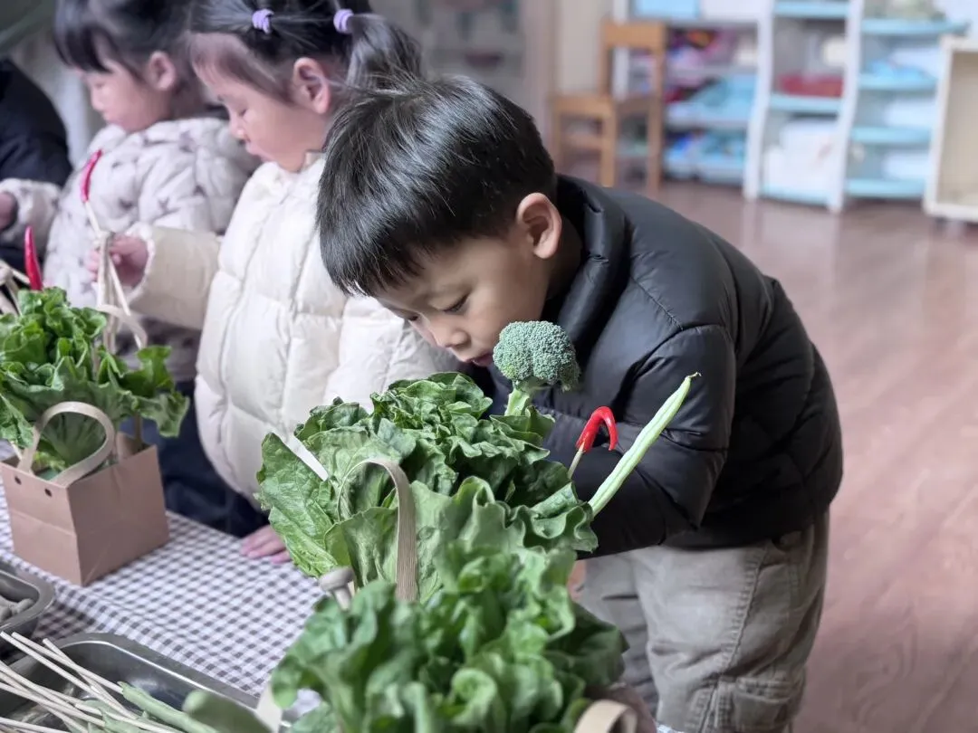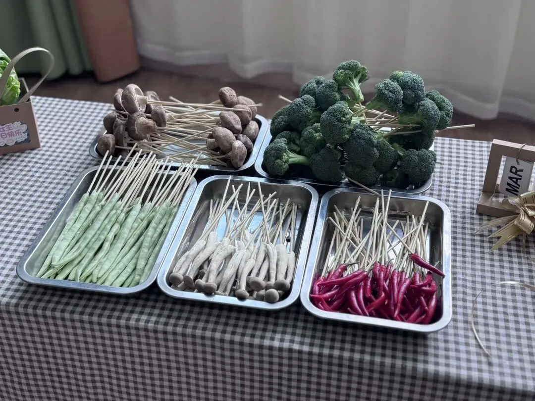 瞧!教室里摆满了新鲜的食材——翠绿的西兰花像小伞,红彤彤的辣椒藏着热情,还有生菜、香菇……每一样都带着泥土的清新,等着宝贝们来“变魔术”。