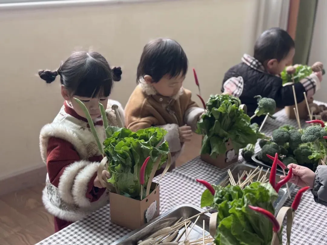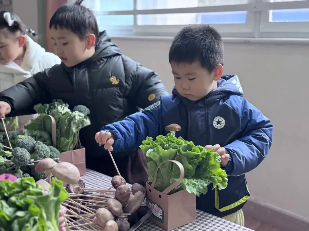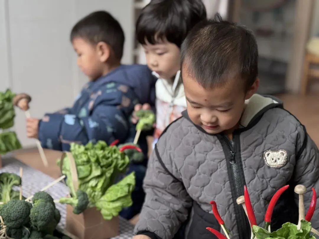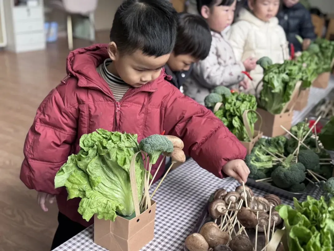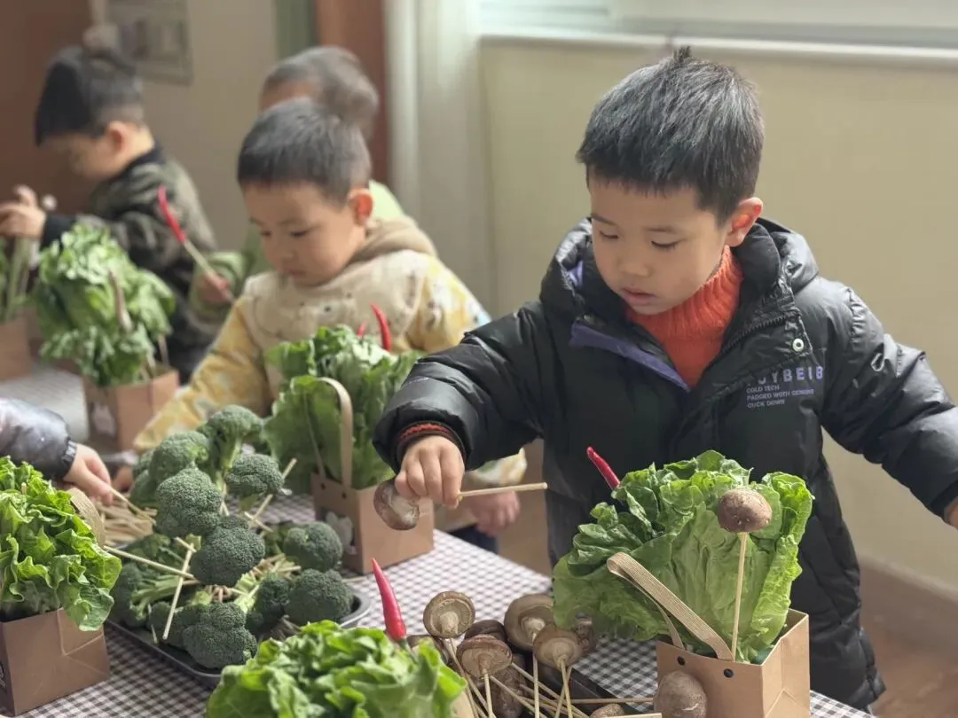 宝贝们自由挑选,一个个化身小小花艺师,用稚嫩的小手,把普通的蔬菜变成了独一无二的花束。