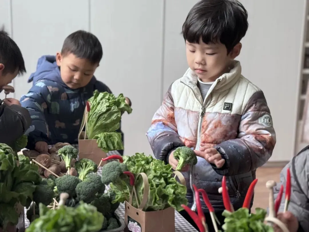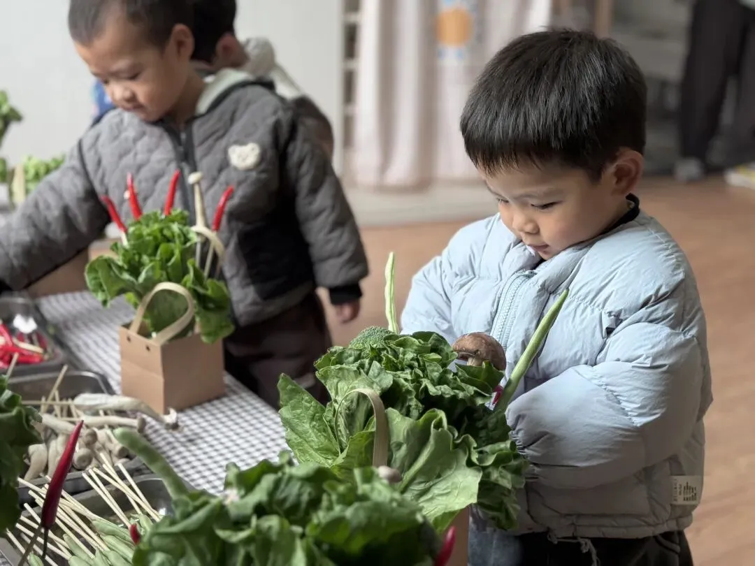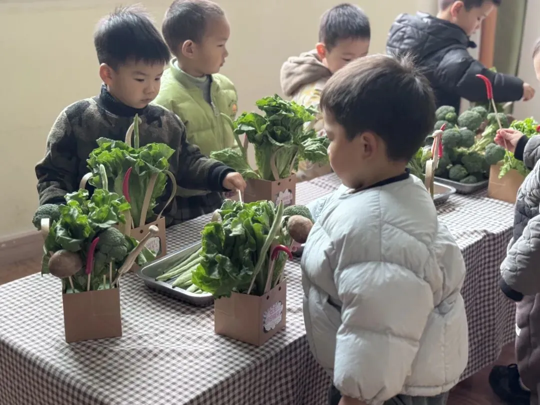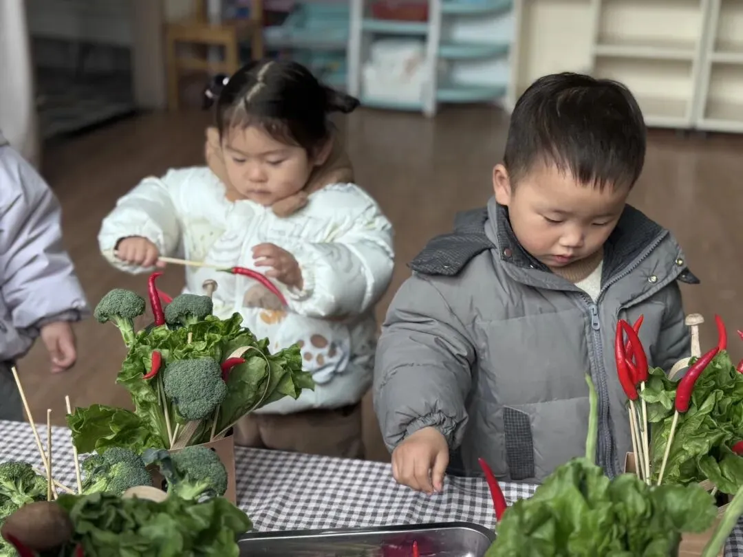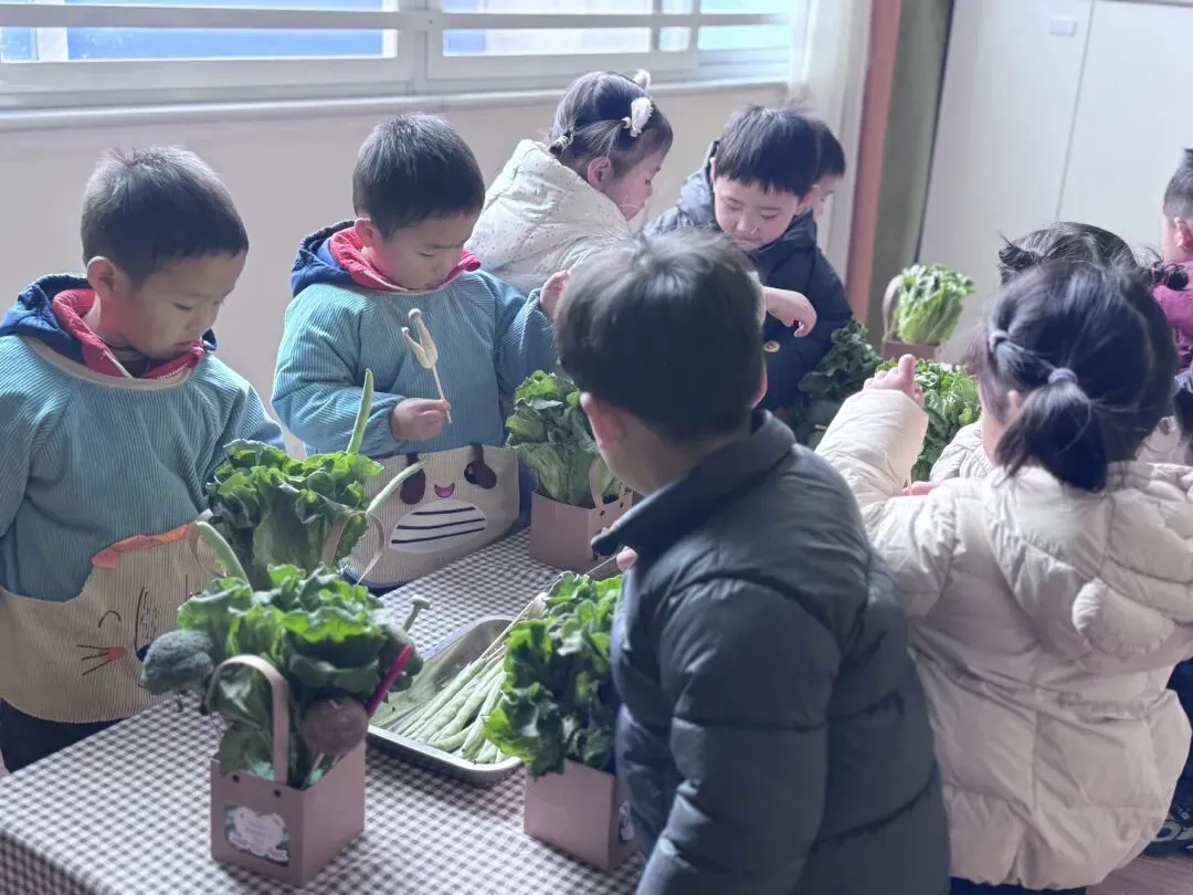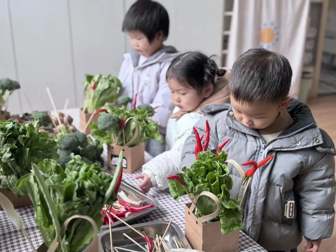 宝贝们自由挑选,一个个化身小小花艺师,用稚嫩的小手,把普通的蔬菜变成了独一无二的花束。