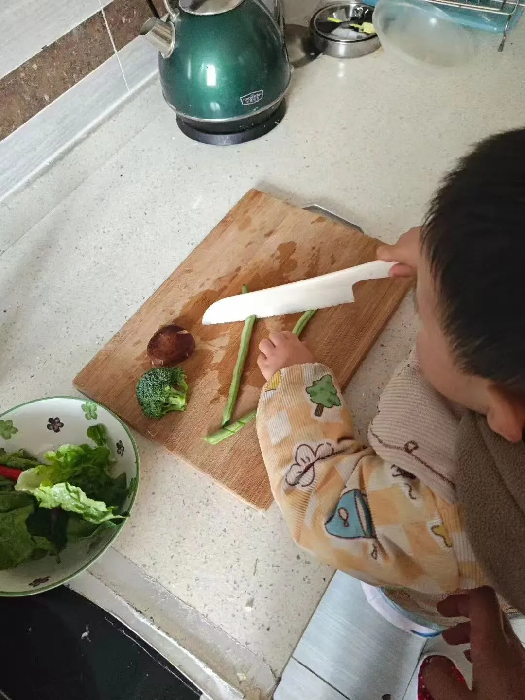 有的家庭把西兰花炒成脆嫩的清炒时蔬,还有的用生菜卷出创意料理……当宝贝们看着自己亲手搭配的花束,变成餐桌上的香气。