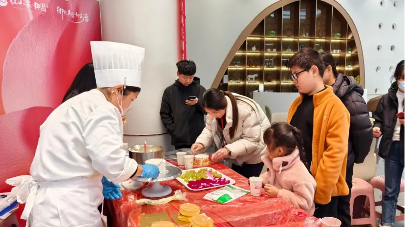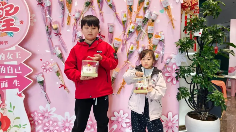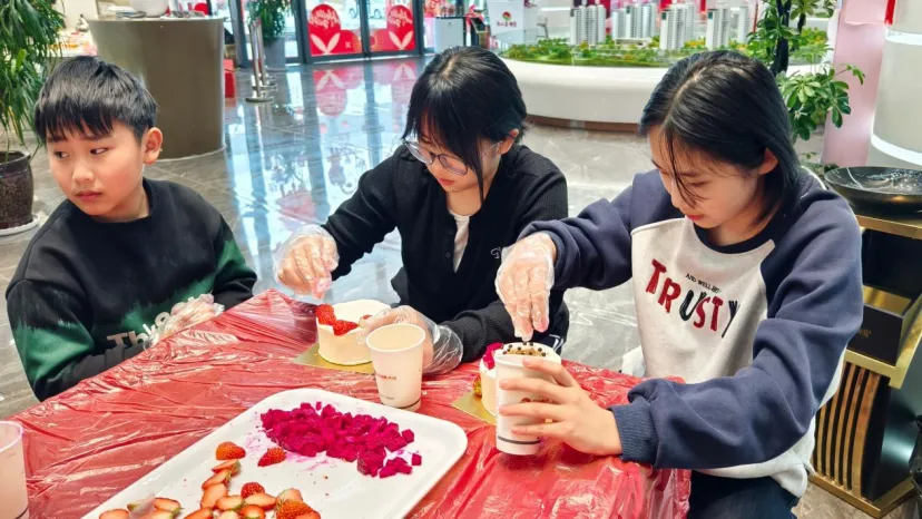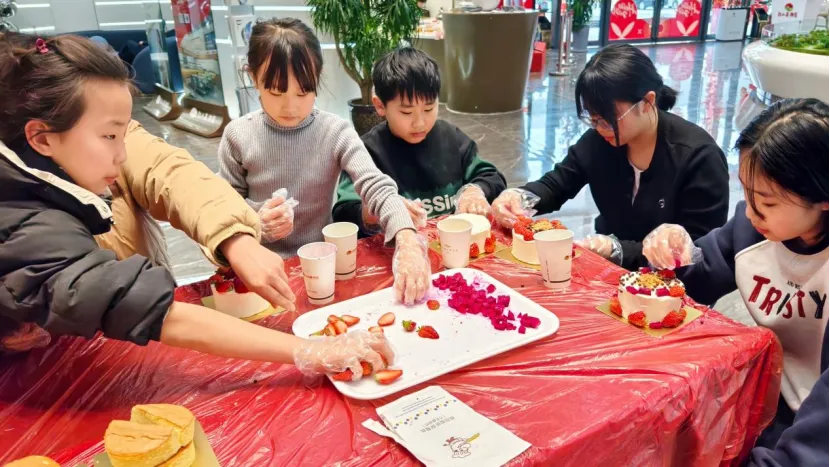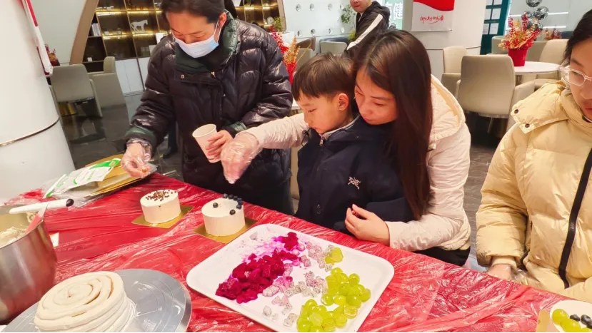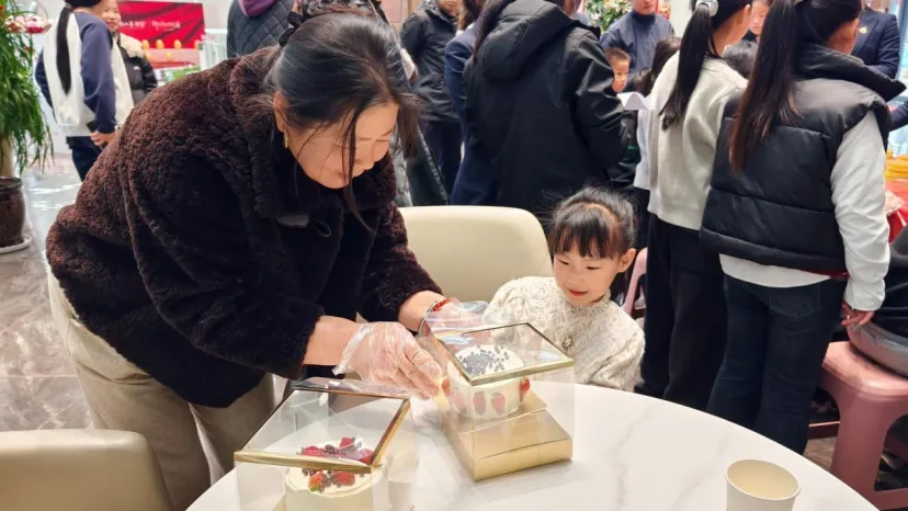 活动正式开始后,烘焙老师就被热情的“学员”团团围住,从抹面的手法到裱花的角度,每一个步骤大家都认真记录。闺蜜们互相拍照记录彼此的“作品诞生记”,家长们弯腰握着孩子的小手一起涂抹奶油,还有女儿专程带着年迈的母亲前来,母女俩头挨着头研究蛋糕装饰的画面,温暖了在场所有人。