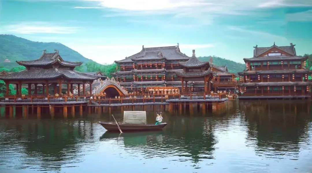 1996年5月,浙江省首个宋文化主题公园在钱塘江边落成开园。2000年,宋城景区自主创作,推出了实景真人演出—《宋城千古情》。宋城景区内东街、西街、北街、市井街、虹桥、风花巷街衢纵横,一派繁华的宋韵景象。