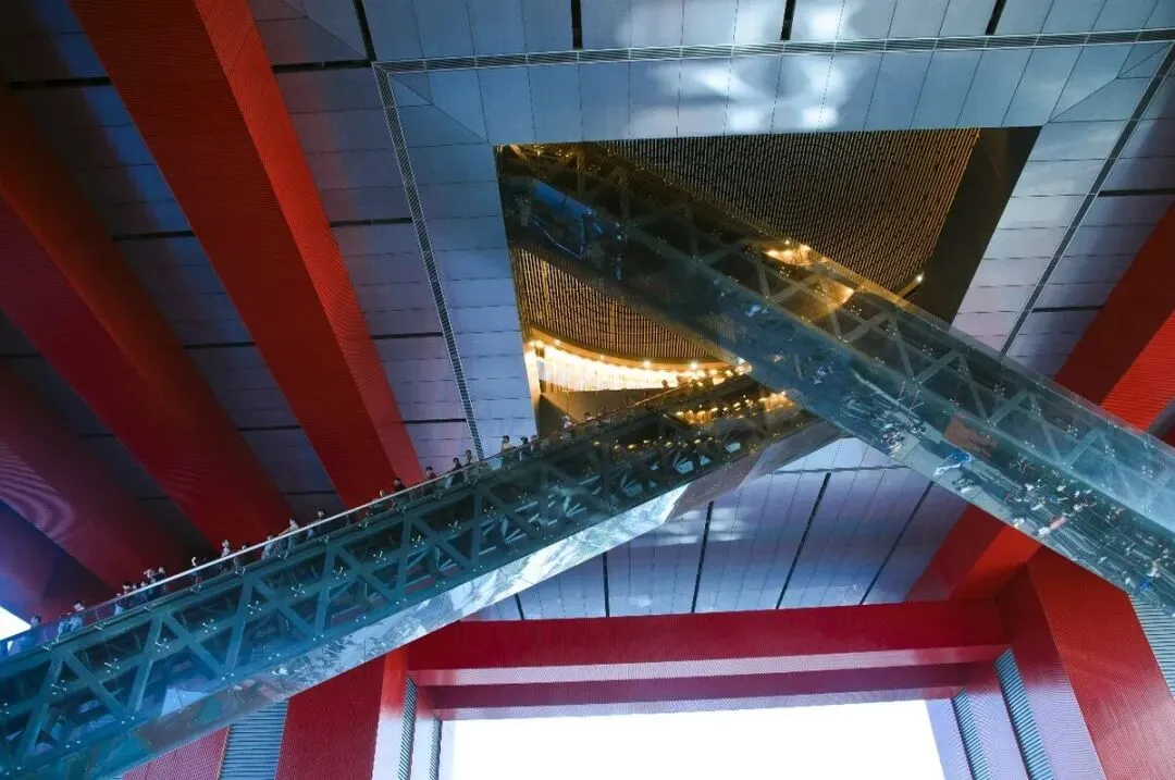中国馆四面均有出入口。多部自动扶梯、垂直电梯通达国家馆展厅及屋顶公共活动平台。地方馆周边设置货运通道,四边开门,便于布展时集中货流的出入。地方馆顶部平台通过台阶通道与北面贯穿世博园的高架步道相连,便于人流疏散。