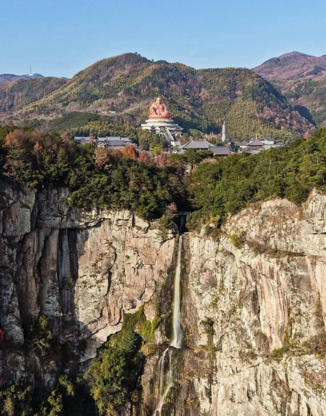 当你的视线从这个峡谷瀑布抬高,你会看到一座悬崖上的城市,这座城市和里边的人,全都被弥勒佛的温暖笑容笼罩着,这里就是浙江宁波的奉化!也是公认的弥勒道场!