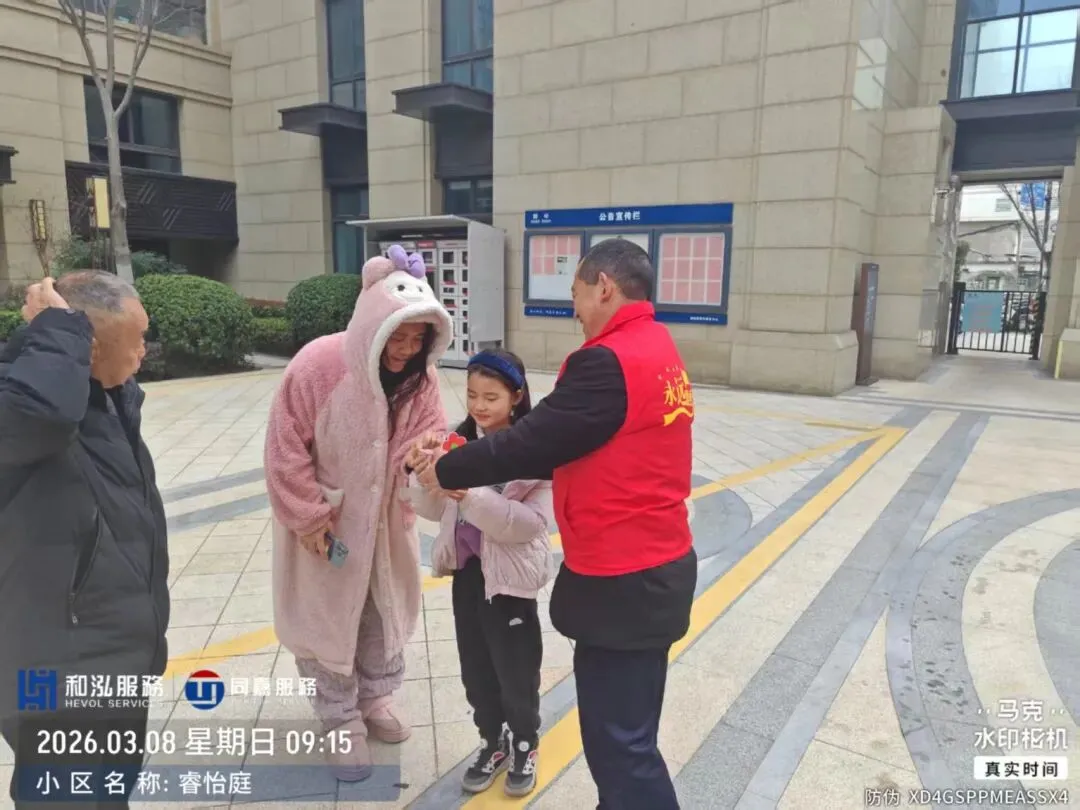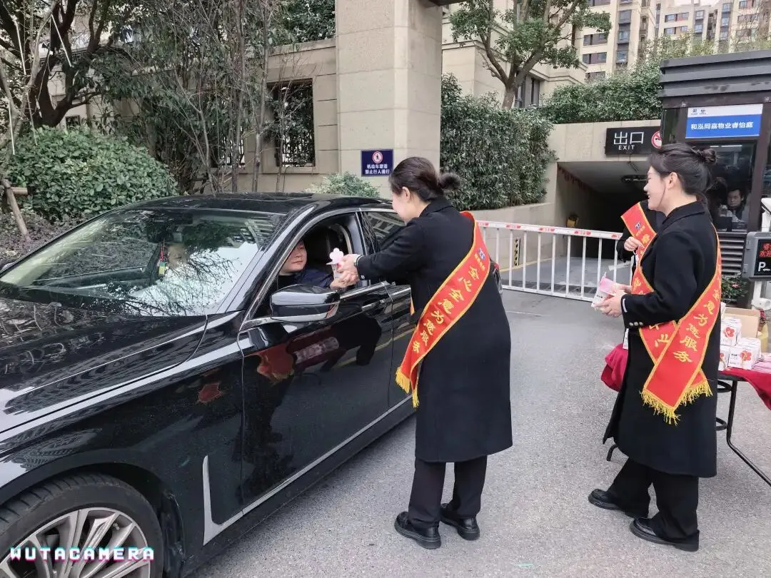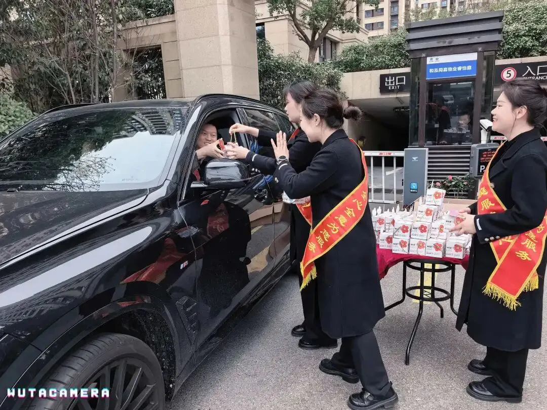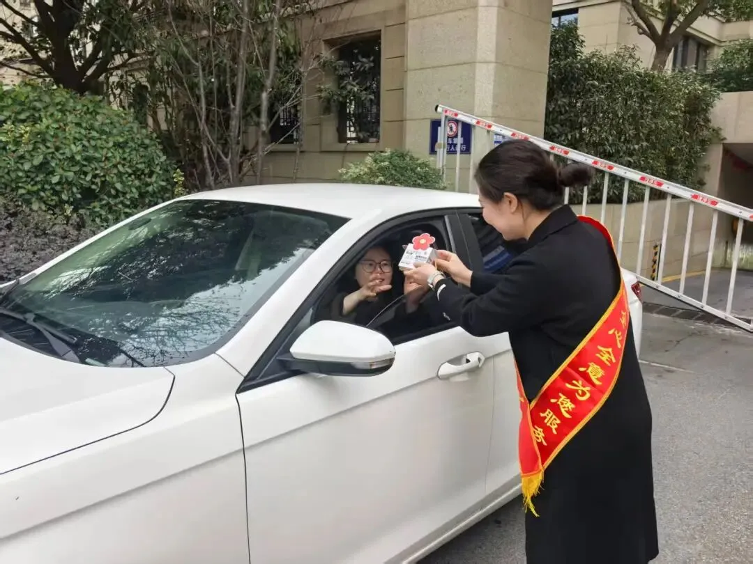 活动同时,北门车辆进出口物业客服团队身着整齐的工装,面带热情的笑容,早早便抵达现场做好准备。正值业主出行高峰,暖心献礼正式拉开帷幕。当业主驾驶车辆缓缓驶入或驶出北门时,客服人员便会主动上前,微笑着致以节日的问候,“女神节快乐!感谢您一直以来对物业工作的支持与理解”。伴随着亲切的话语,定制礼品与祝福贺卡被一一送到业主手中。带着孩子出行的张女士接过礼物后,还特意让孩子向客服人员道谢:“物业太贴心了,还准备了这么用心的礼物,住在睿怡庭特别有幸福感。”