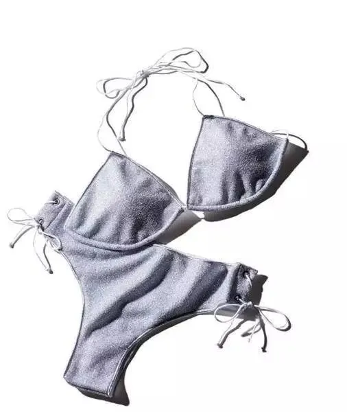 细腻珠光的闪耀、奢华的吊带很有成熟韵味。泳裤上自然的系带设计很是抢眼。