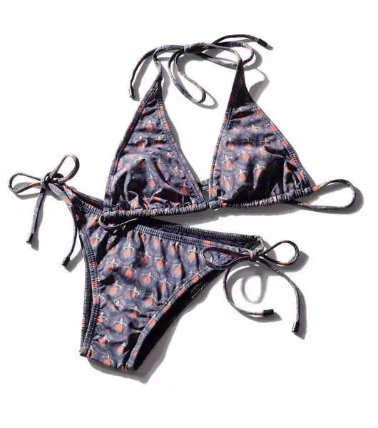 散发出复古感觉的暗灰色的话即使是热带图案也能彰显成熟韵味。上衣跟泳裤的蝴蝶结系带增加俏皮感。