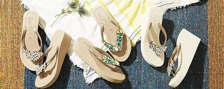 奢华的沙滩凉拖是在曼哈顿的工坊里由职匠们手工制作而成。施华洛世奇水晶或者玻璃装饰仔细地缝制在凉拖上。中跟坡跟和高跟坡跟的凉拖可以使双腿显得修长。
