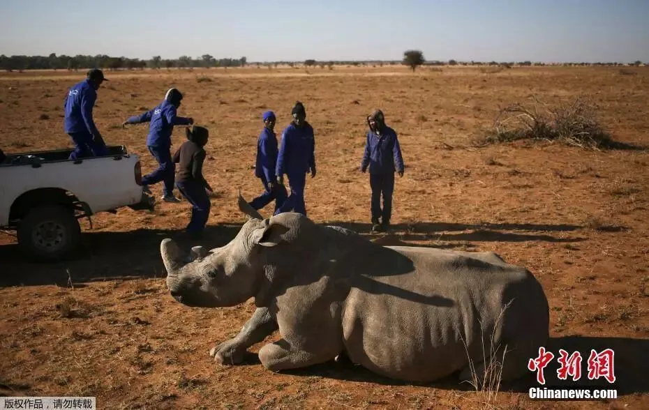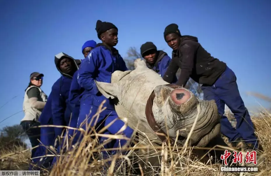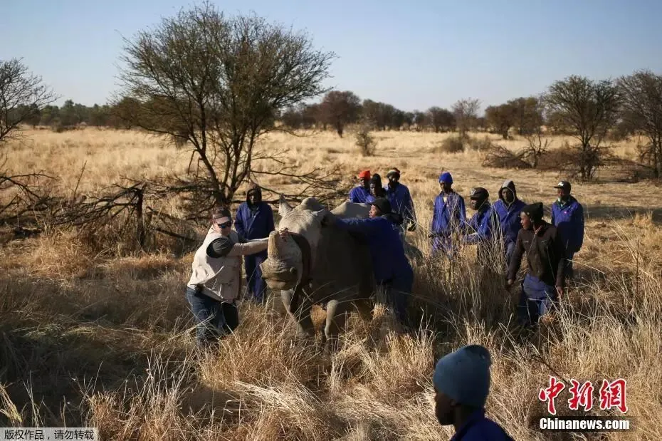 图为当地时间2017年8月14日,南非西北省,一名工作人员在为一头犀牛锯角,这是一种保护犀牛的行为,可以防止它们丧命于偷猎者的枪口下。