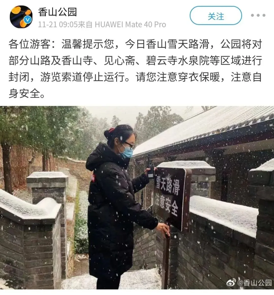 @香山公园 发布通知:因雪天路滑,公园将对部分山路及香山寺等区域进行封闭。