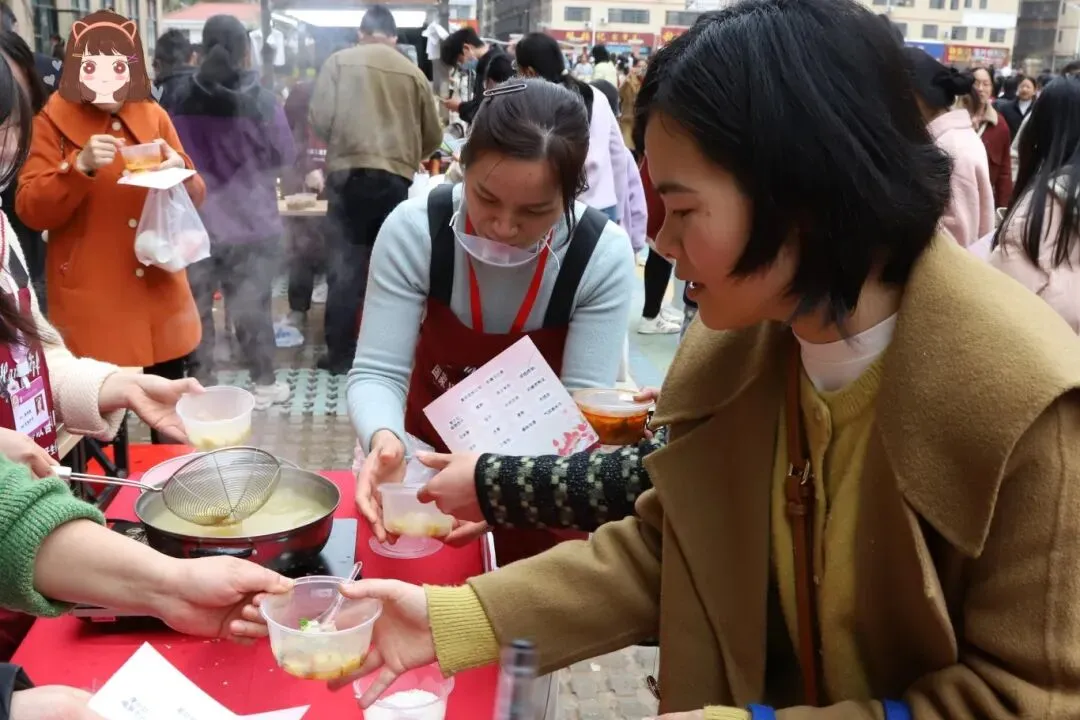 从网红福鼎肉片、妇保嗦粉、赤土米冻,到艾米果、饺子、烤肠、豆花、水果、蛋糕……13个美食摊位前人头攒动。大家一边品尝,一边点赞:“这也太丰富了吧!”中药花茶和药膳老鸭汤更是让人感受到浓浓的养生关怀。