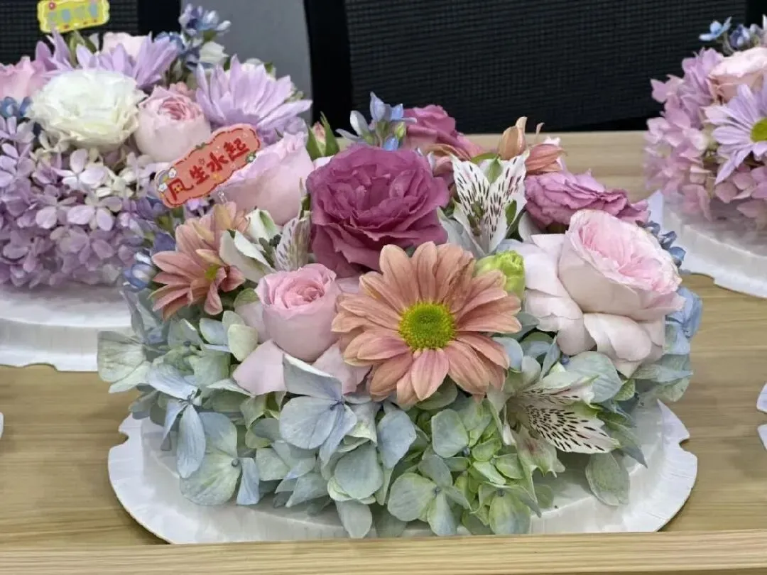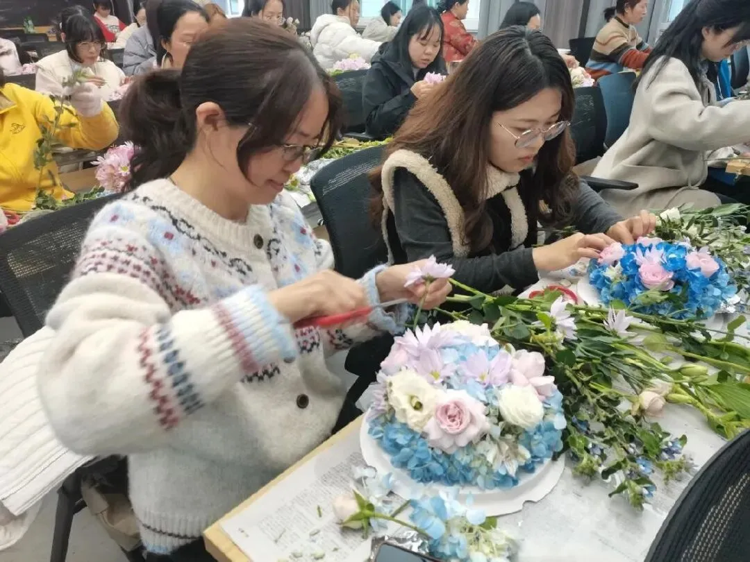 进入实操环节,女神们充分发挥想象力,剪枝、修叶、插花、装饰……在一修一剪之间,一盆盆细致精美、别出心裁的插花作品逐渐呈现在眼前。大家捧着自创的作品相互展示、拍照留念,报告厅内欢声笑语不断。这场持续一个半小时的活动,不仅让大家掌握了基础的花艺技能,更在指尖的灵动中感受到了生活的美好。
