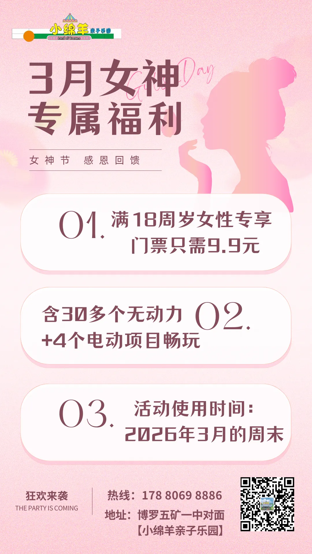 当前位置:首页>美女资讯>好消息 /女神节福利延续到3月的每个周六周日/特惠票价:9.9元/人(原价40元)/满18周岁女性携带相关证件/来#小绵羊亲子乐园 尽情撒欢~