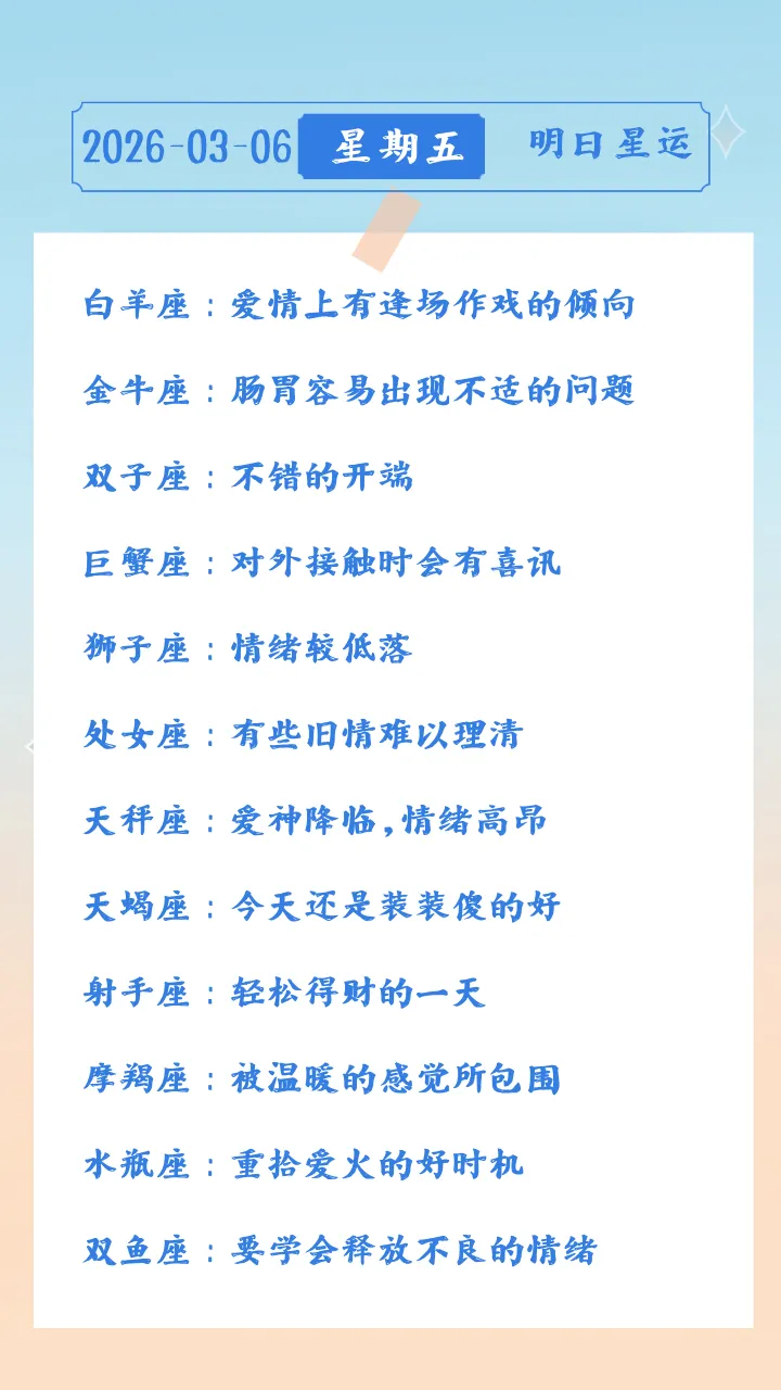 当前位置:首页>美女资讯>陈青今日星座运势2026年3月6日(图片版)