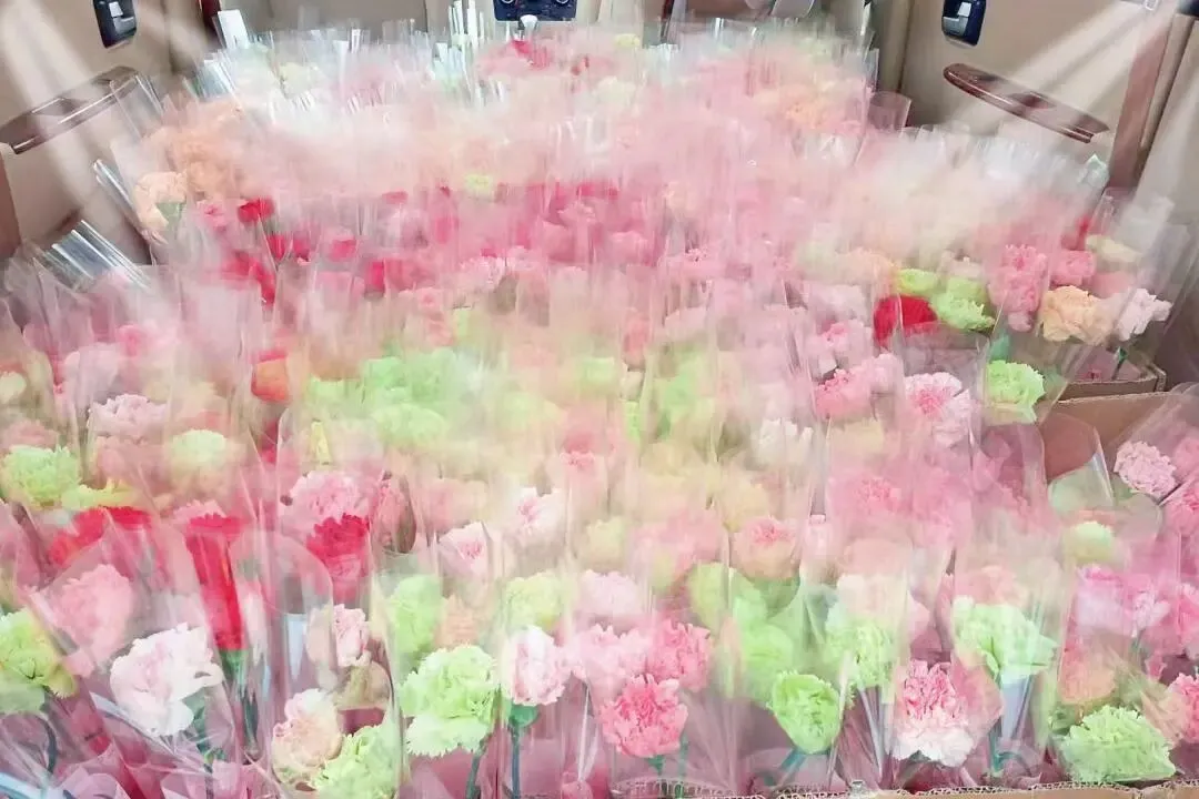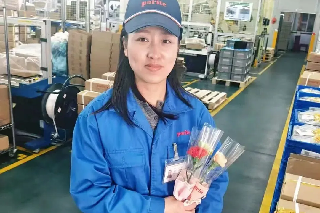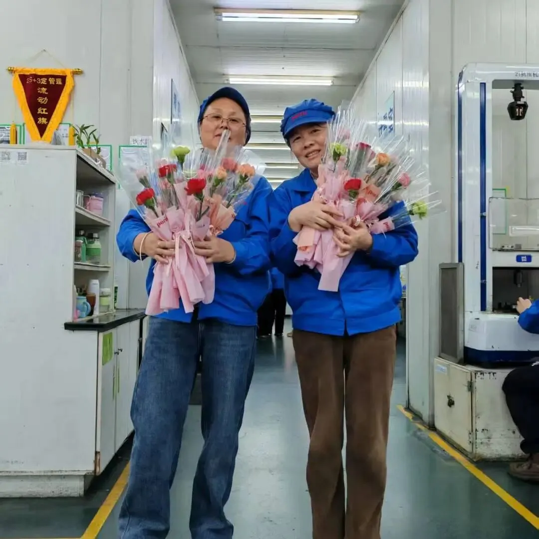 活动现场温馨满满,工会工作人员将一束束娇艳欲滴的康乃馨送到每位女职工手中,鲜花馥郁芬芳,承载着公司对女职工的关怀与敬意。手捧鲜花的女职工们笑意盈盈,纷纷为这份贴心的礼物点赞,现场洋溢着温馨与喜悦的氛围。