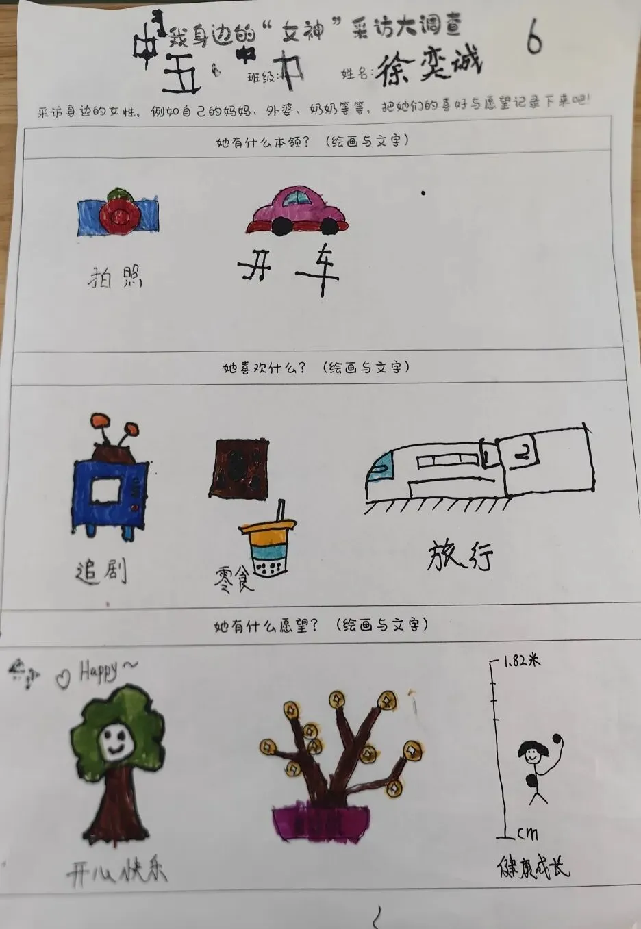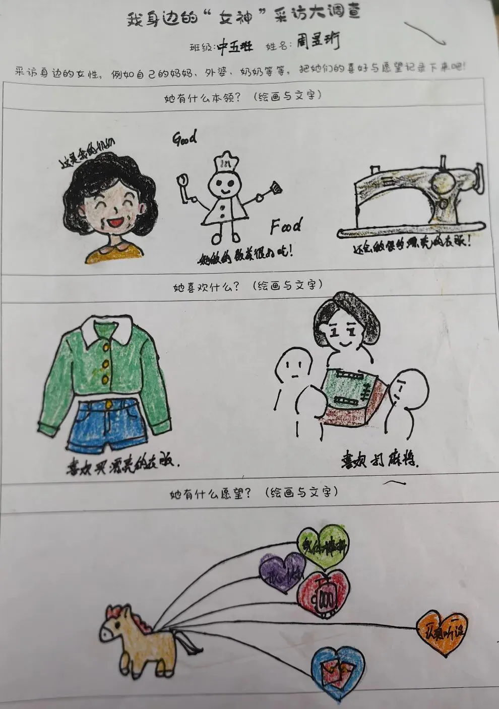 最有趣的当属“采访发布会”环节!宝贝们化身小小记者,带着调查问卷,认真采访妈妈、奶奶、外婆、老师等身边的女性,记录下她们的喜好、愿望,细心观察着她们的“闪光点”。