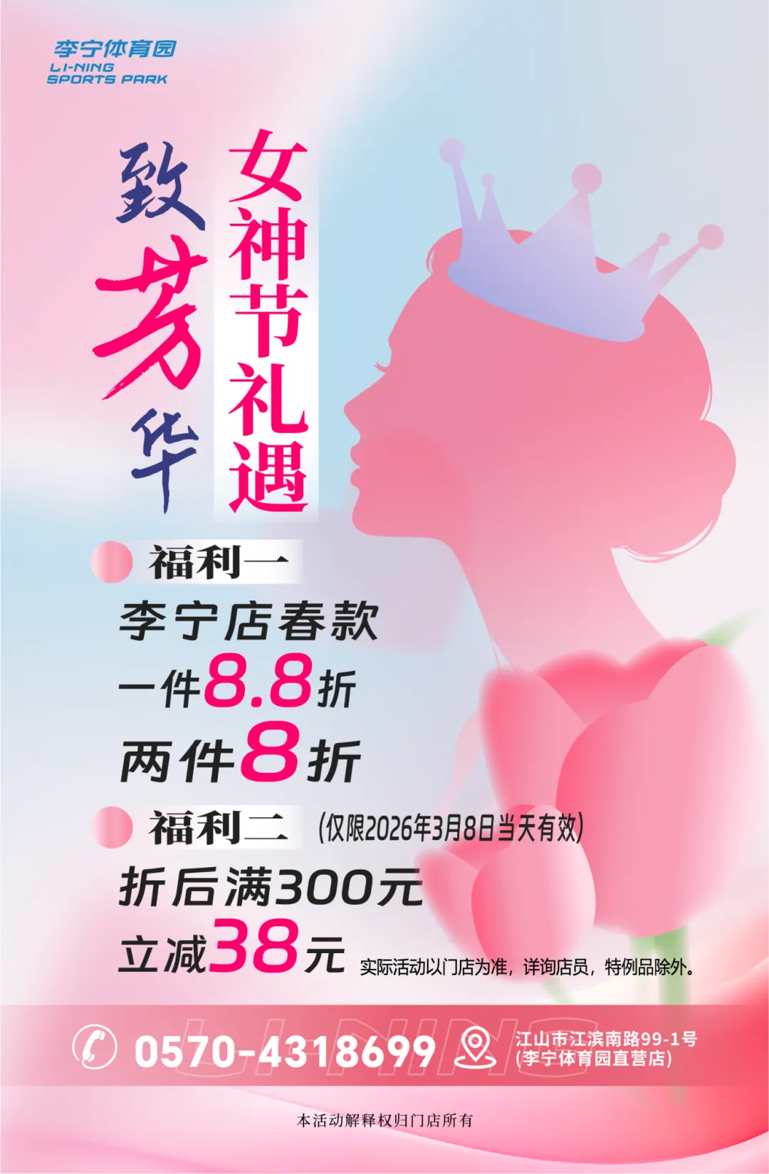 当前位置:首页>美女资讯>限时福利|李宁体育园3・8女神节专属福利来袭!李宁服饰折后满减,健身、游泳、攀岩私教课程特惠来袭,名额有限,先到先得!