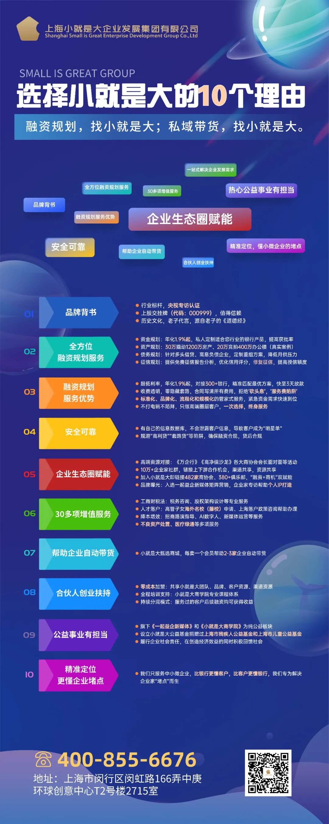 韦秀进一步介绍了小就是大构建的一整套生态体系:包括甄选公司、商学院、新媒体公司、会员体系、万企行等。这些板块相互支撑,形成闭环,482家商协会、380家俱乐部、300+银行资源,以及超过100000+可链接的企业资源,为中小企业提供从融资规划到财务顾问、从人才培养到品牌传播的全方位服务。