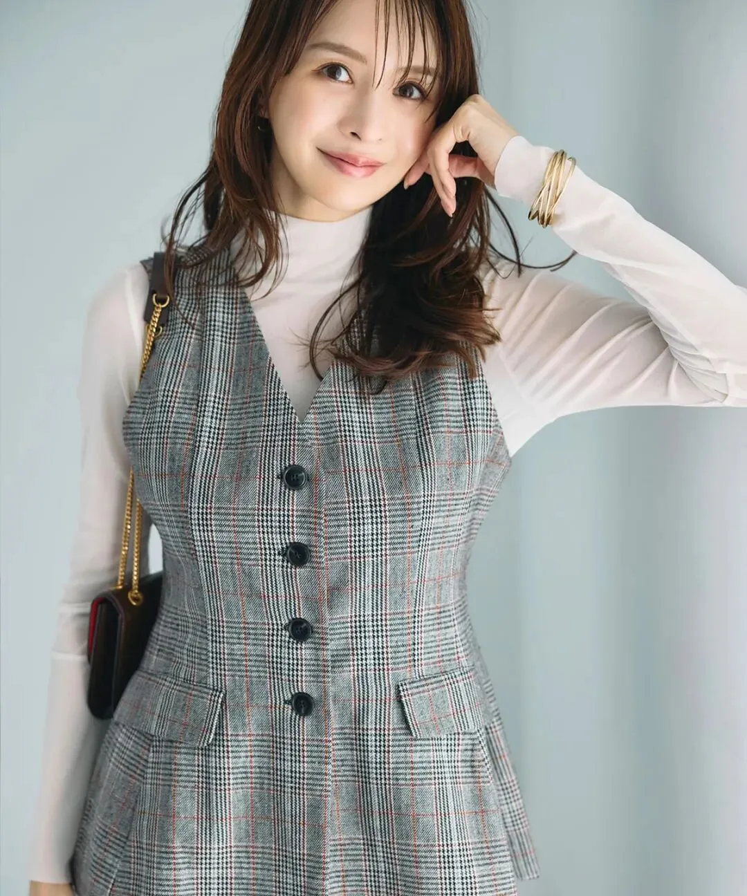 低调灰色融合格纹纹理的马甲套裙,带来知性魅力。内搭透感白色营造出神秘妩媚的气息,令造型富有女人味。