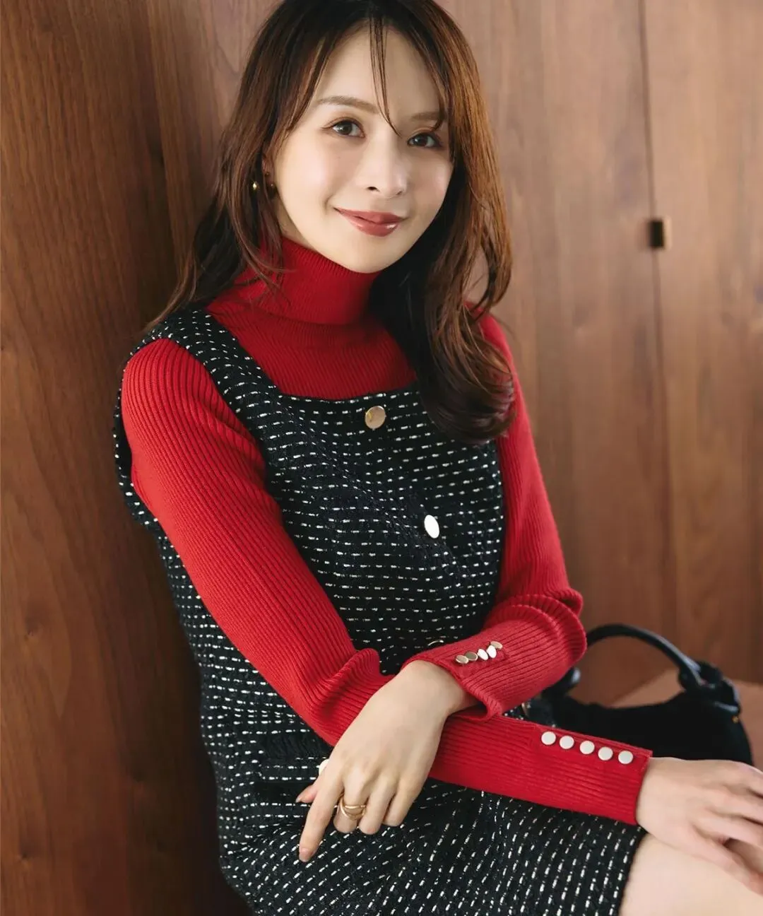 黑色花呢面料的营造出经典的复古老钱风,内搭亮眼的红色,让暖意由内而外蔓延,乍暖还寒的季节也不觉得寒冷。