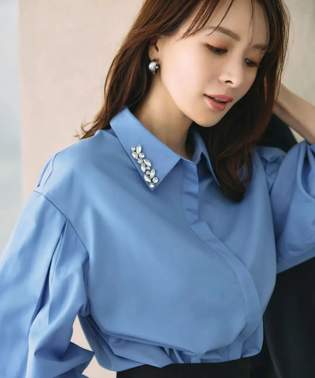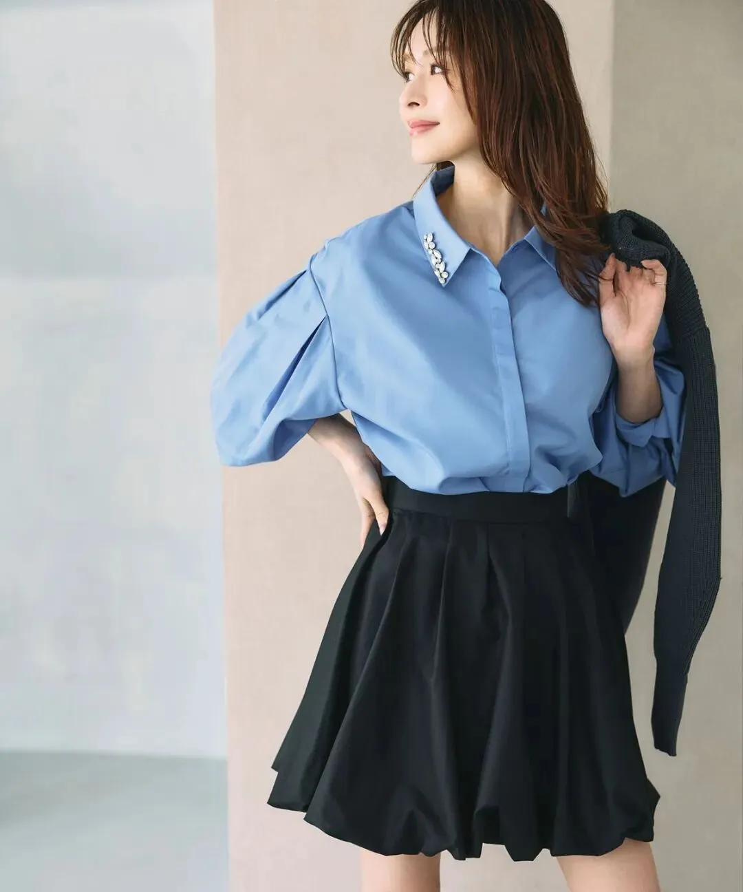 职场风很强烈的蓝色衬衫,因为领口的钻饰设计而变得新颖,搭配黑色花苞百褶裙,暗黑神秘中透露出甜蜜的气息。