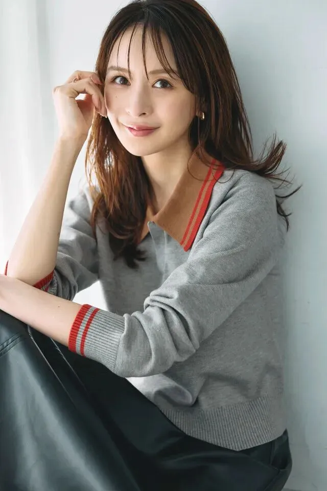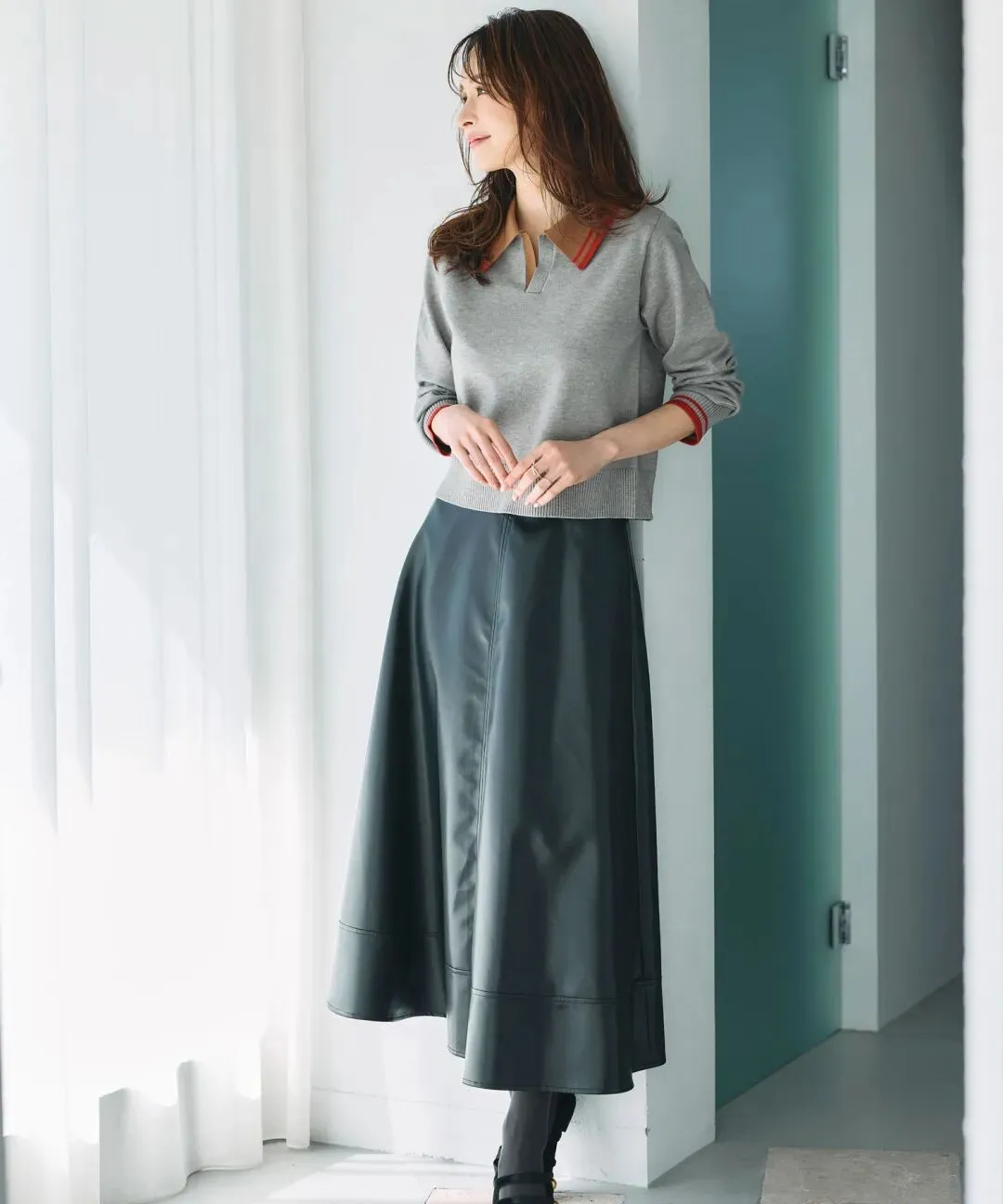 素雅的灰色针织衫百搭耐看,领口与袖口的橘棕色点缀,展现出气质满分的意式趣味。搭配黑色皮裙,尽显不凡气质。