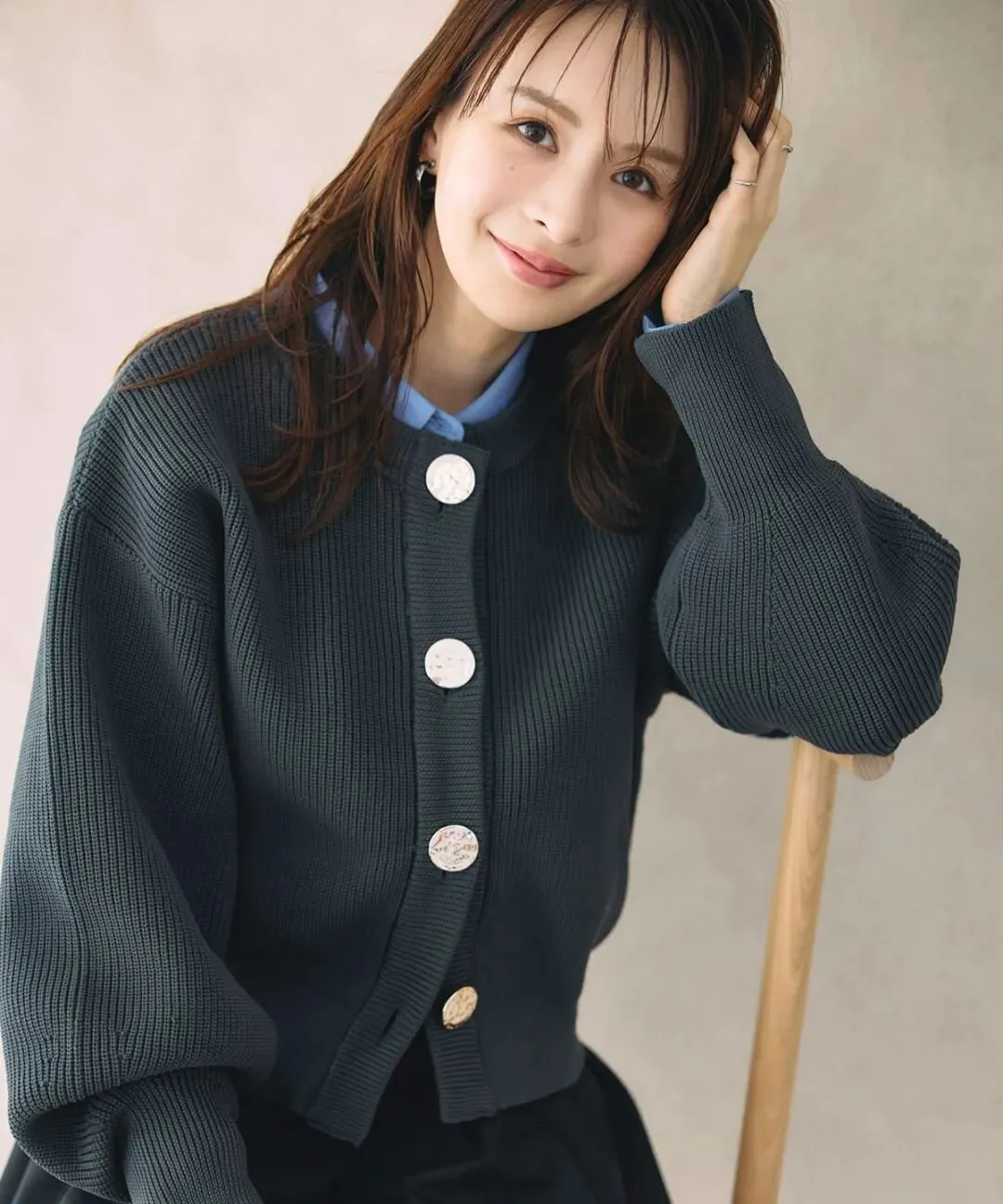 泡泡袖的设计,令普通的黑色针织衫变得圆润可爱起来,同时大体量的圆形纽扣也加强了造型感,不管搭配裙装还是裤装,都能唤醒优雅。