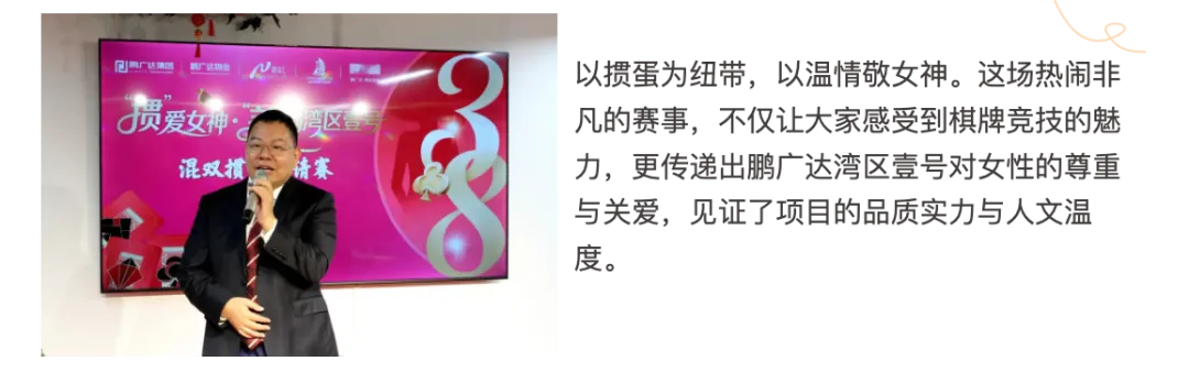 从职场精英到家庭支柱,从温柔母亲到独立女性,她们以坚韧与智慧撑起半边天,用热爱与担当书写精彩人生。在这个专属节日里,鹏广达·湾区壹号以自身为平台,拥抱每位掼蛋女神,以牌为媒、以乐为伴,赛场上,女神们沉着冷静、精准出牌,男士搭档全力配合、默契护航,一攻一守间尽显风度,一牌一局中满是尊重,完美诠释“男女搭配,乐趣加倍”的真谛。