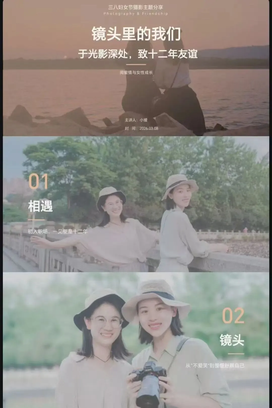 两个郴州姑娘,从职场小白到彼此的人生摄影师,她用一张张照片讲述了这段治愈系友情。“以前我拍照从不笑,是她举着相机追着我跑了十二年,直到我能在镜头前笑出鱼尾纹。”原来最好的作品,真的是时间。 小媛说,她们互为缪斯,也互为铠甲。