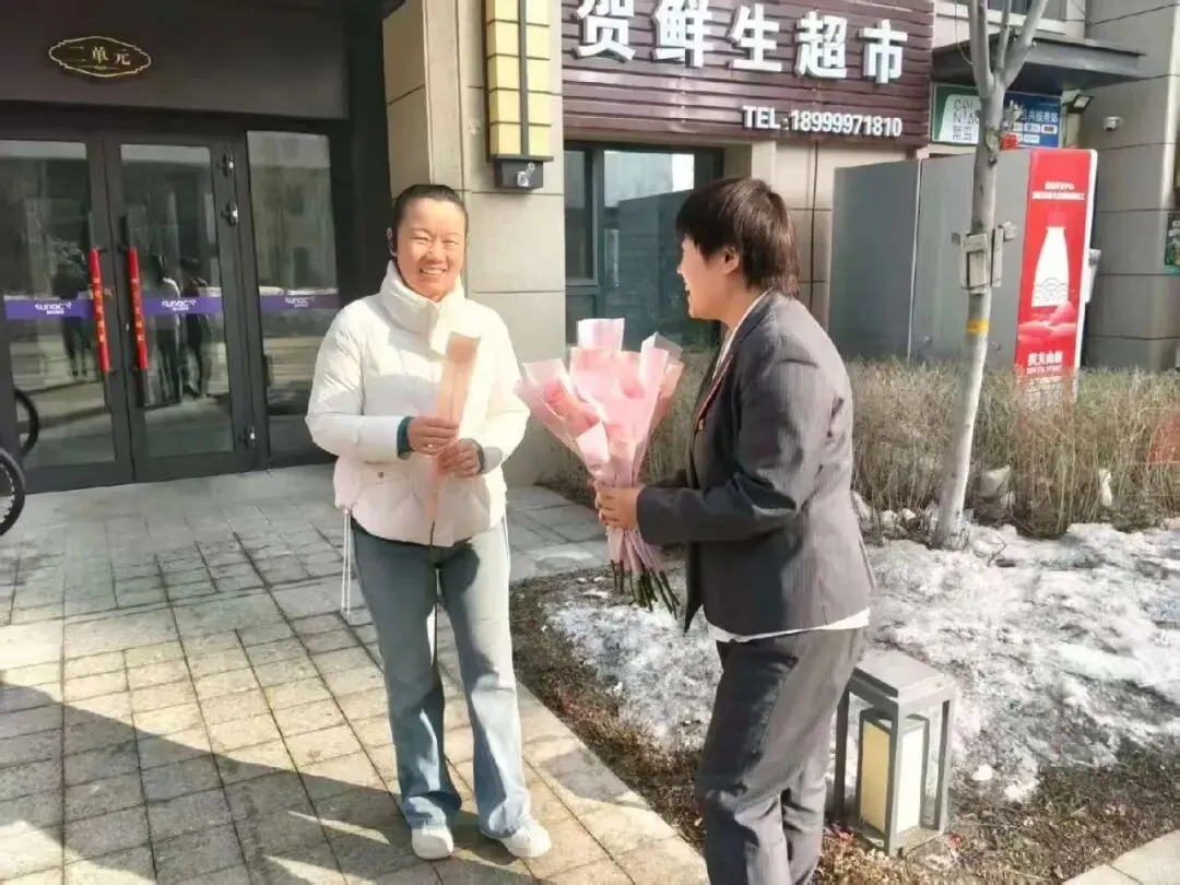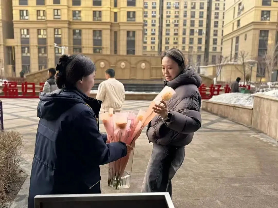 当业主们步履匆匆地准备开启新一天的生活时,物业工作人员微笑着递上鲜花:“女神节快乐!”接过鲜花的瞬间,惊喜与笑意爬上了业主们的脸庞。物业工作人员不仅为小区业主送上鲜花,还穿梭在各个商铺之间,为女商户们送去节日的问候。暮色降临,仍有工作人员坚守在岗位上,当最后一位业主接过鲜花时,一天的疲惫似乎都在这花香中消散了。