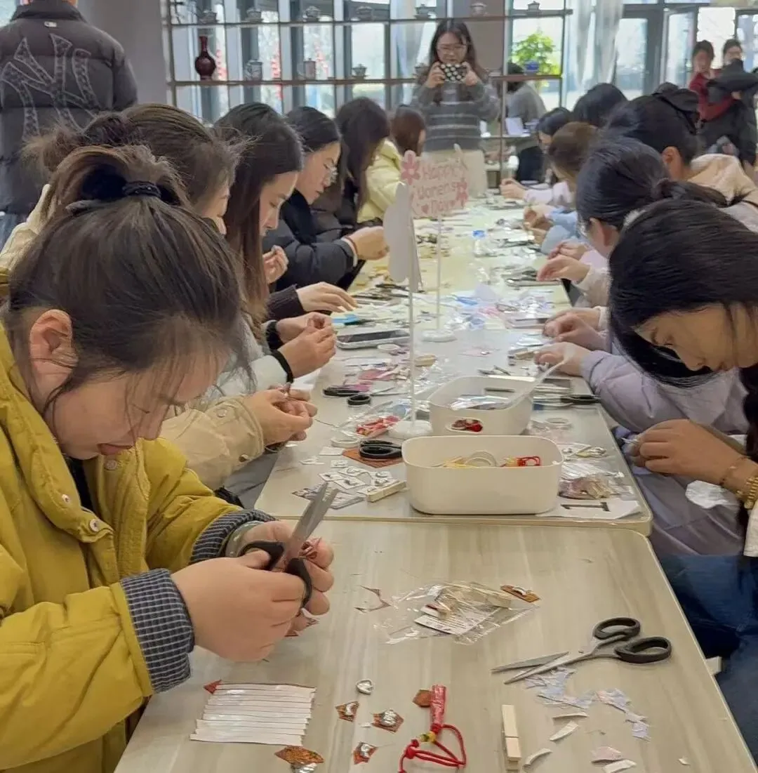 北华环保科技公司 & 金融监督管理局的女神们联袂而来,她们选择了“陶艺成品+扎染发圈”的组合。一件件精美的陶艺作品在手中诞生,独一无二的扎染发圈更是为节日增添了一份灵动。看,她们专注的眼神,仿佛在雕琢一段美好的时光。
