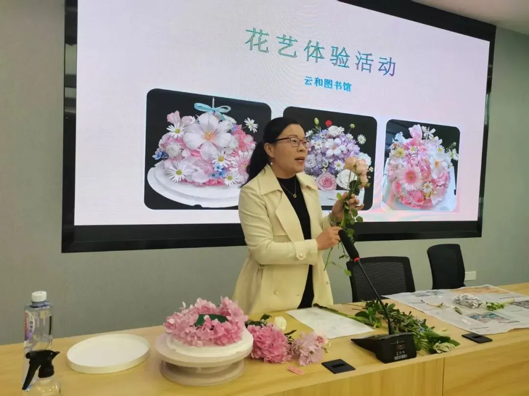 活动现场,花香四溢,气氛温馨。现场工作人员向大家分发了鲜花、花泥、剪刀等工具,图书馆陈丽红馆长向大家详细讲解了插花的基本技巧,从花材的选择到色彩的搭配,从层次的构建到情感的融入,大家听得聚精会神。
