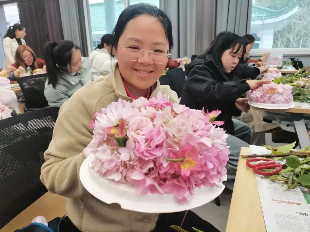 进入实操环节,女神们充分发挥想象力,剪枝、修叶、插花、装饰……在一修一剪之间,一盆盆细致精美、别出心裁的插花作品逐渐呈现在眼前。大家捧着自创的作品相互展示、拍照留念,报告厅内欢声笑语不断。这场持续一个半小时的活动,不仅让大家掌握了基础的花艺技能,更在指尖的灵动中感受到了生活的美好。