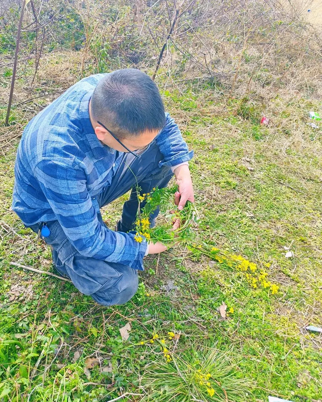 老公不知道从哪里编了一个油菜花的花环,轻轻戴在我头上。
