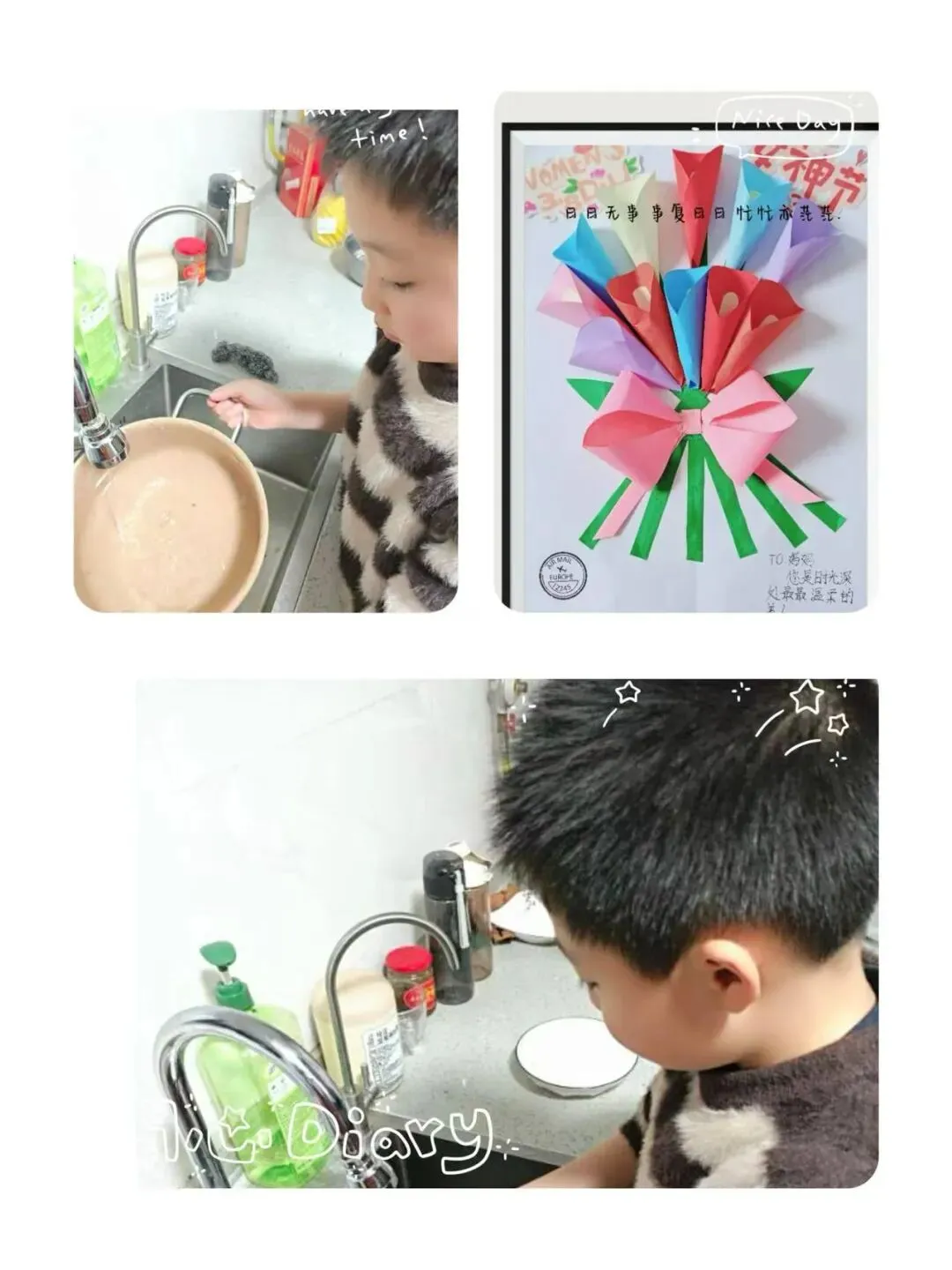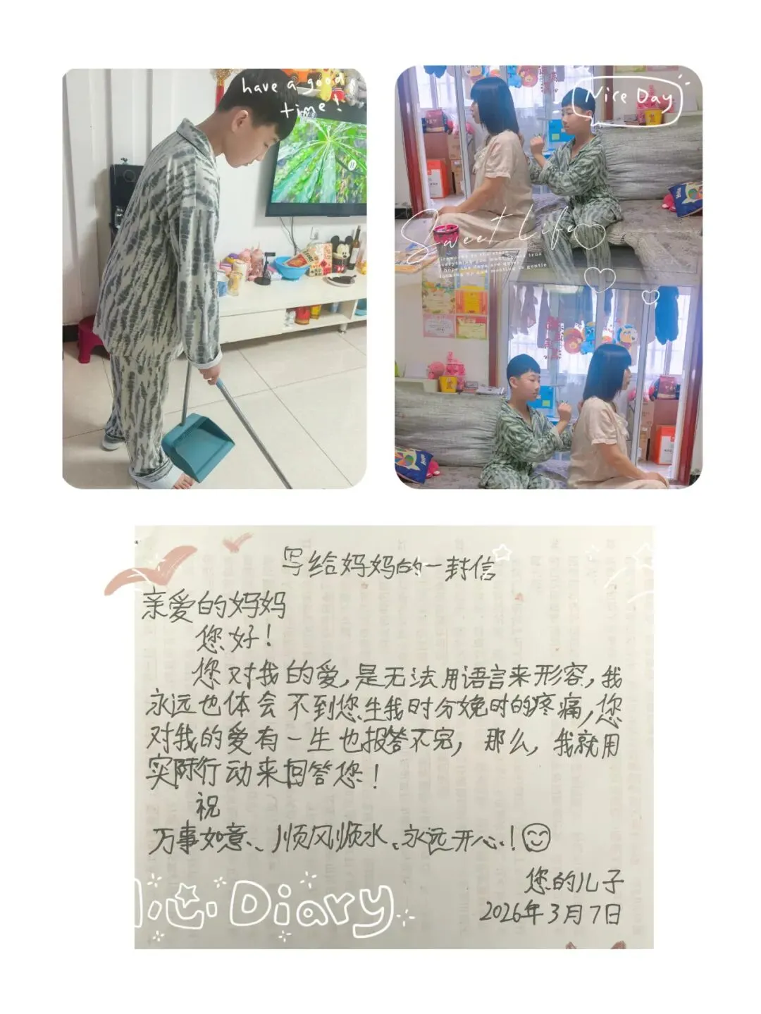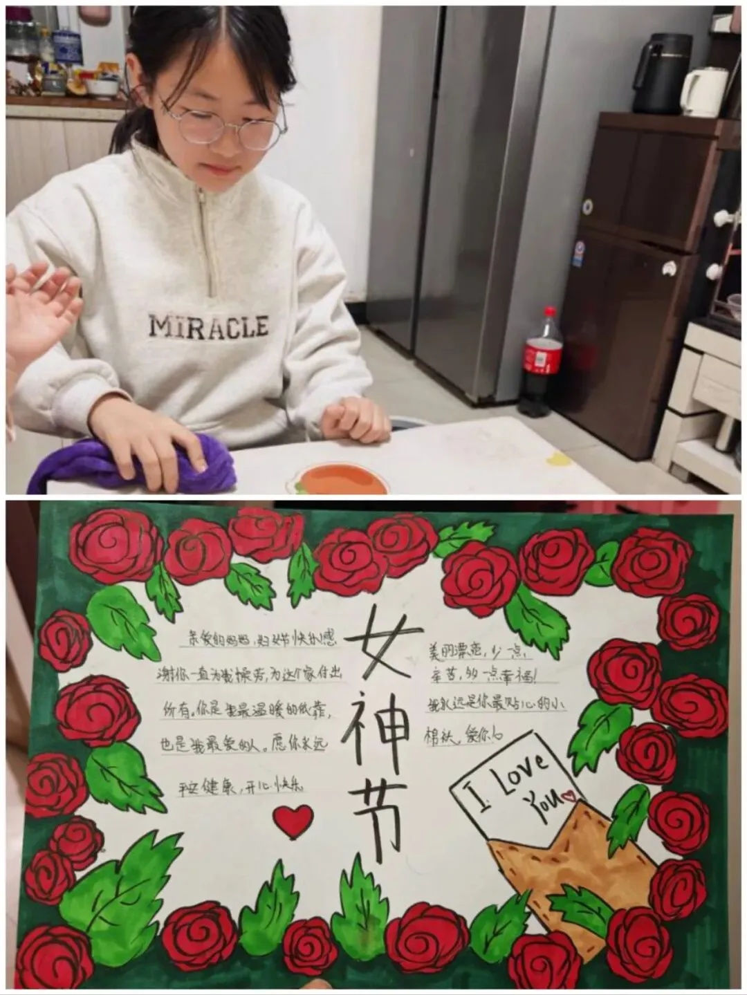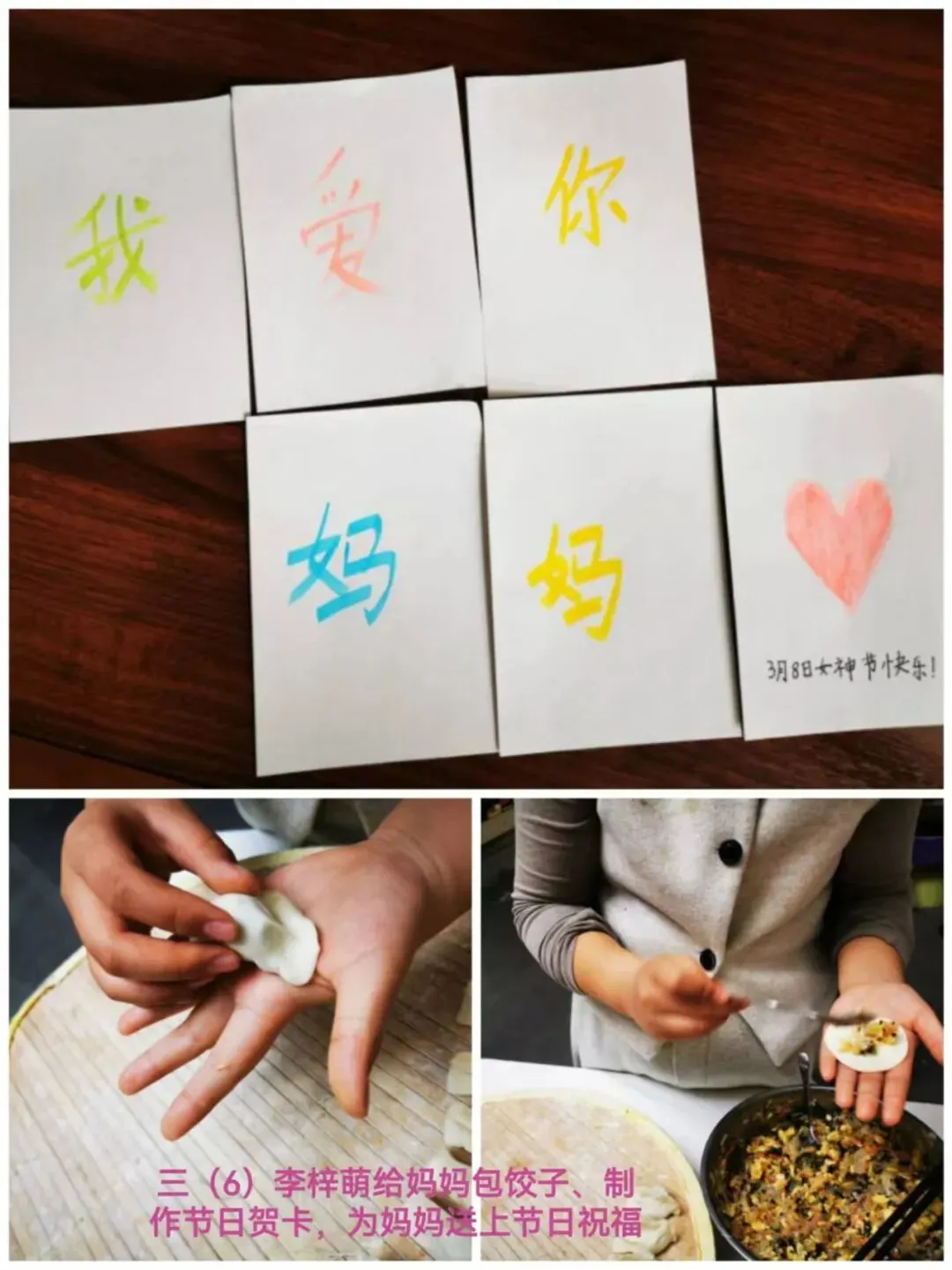 随后,同学们将这份感恩知心化作了实际行动,以多样形式表达出自己的心意,他们或执笔写下感恩家书、手绘暖心图画,用笔墨传递温情,或主动为家中女性长辈端茶捶背、分担家务,用点滴小事诠释关爱,让感恩从校园延伸到生活日常。