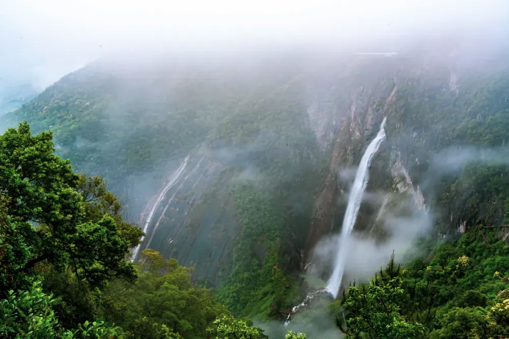 岱仙双瀑总落差314米,单级落差达184米,被誉为“华东第一瀑”,是国内难得一见的双瀑。由岱仙瀑布和油漏漈瀑布组成。东边的岱仙瀑布高约184米,宽10-26米,不羁的溪水如烈马脱羁,雄浑奔放,气势非凡;西边的油漏漈瀑布高约120多米,宽110多米,瀑水依崖缓流,恰似珠帘下垂,温和婀娜。