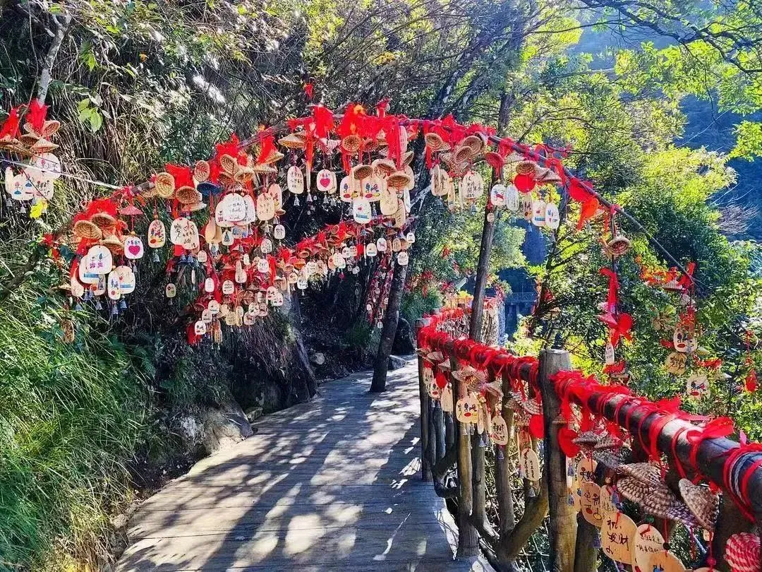 位于岱仙瀑布两侧,从远处看,两边的栈道整体呈一个心形,蜿蜒盘桓在崖壁上,心形栈道全程3000米,高差314米,是中国唯一的心形立体环瀑栈道。