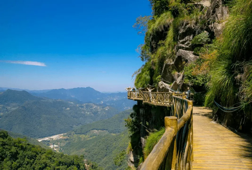 走在悬崖栈道上,凭栏探首,峭险渊深,令人心虚目眩。放眼望去,远处、不远处的山峰层峦叠嶂,由近及远,仿佛一幅色彩由浓及淡的中国水墨画。