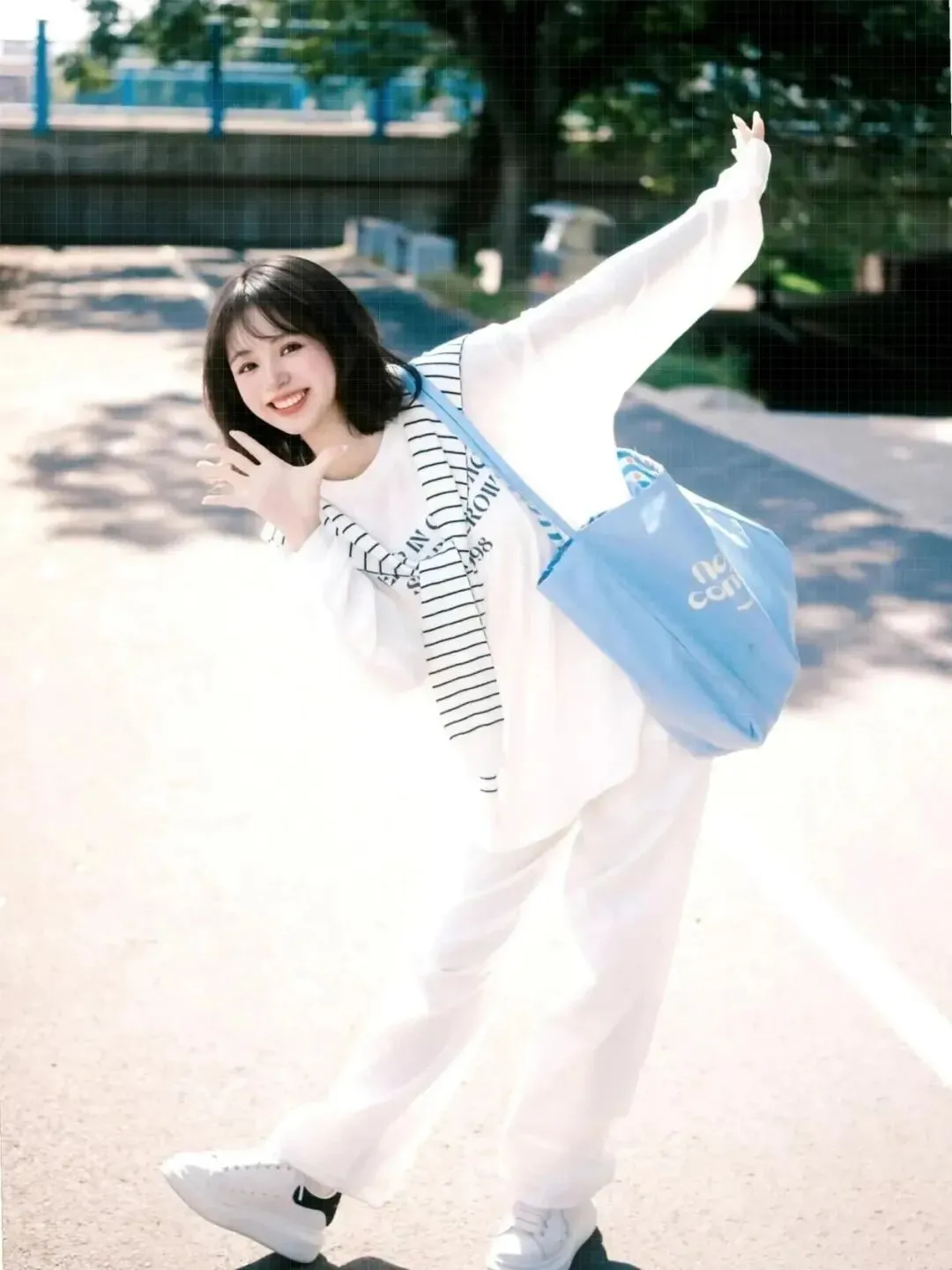 单脚踮起、身体微斜,一只手比耶放身前,另一只手插兜——核心是“不对称的松弛”。踮脚让身体有向上的动感,歪头弧度中和了活力感,搭配嘟嘴表情,少女感直接溢出屏幕。特意选林荫道的白线条做背景引导线,让画面更有延伸感,阳光在白衣服上的明暗层次,也让造型更有质感。