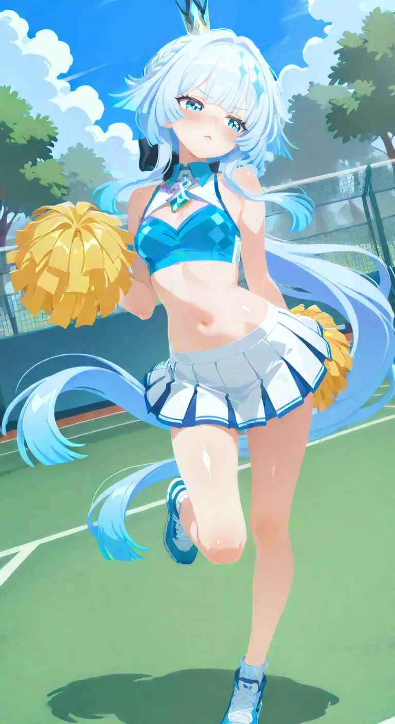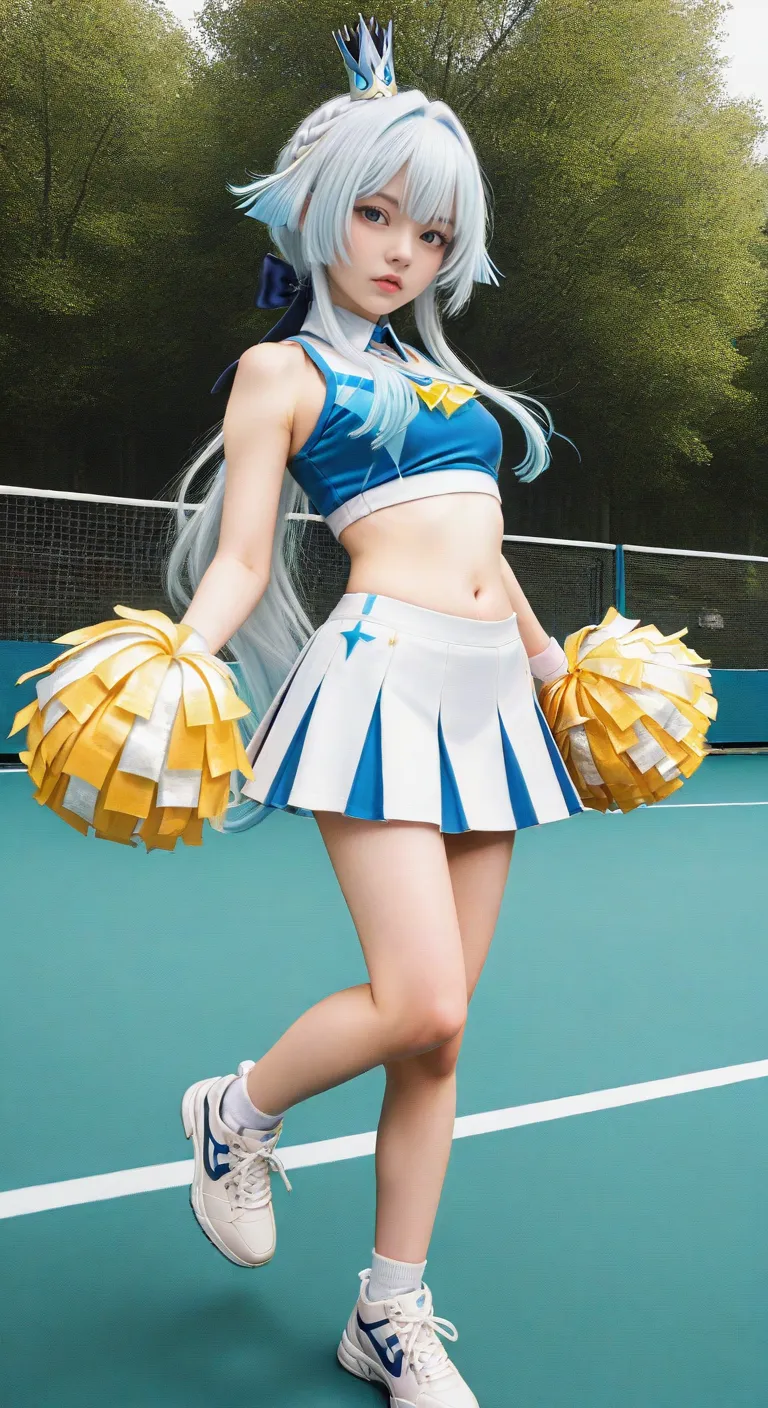 早上的阳光有些刺眼,我们来到了体育馆的网球场。刻律德菈换上了露腰的啦啦队服,手里拿着两团彩球。这身极具活力的装扮让她看起来有些别扭,她似乎不太习惯这种过于直白的“加油”方式。但在镜头对准她的那一刻,她立刻进入了状态,虽然动作依然带着一种指挥千军万马的严谨,但那种努力想要展现元气的样子却可爱得犯规。